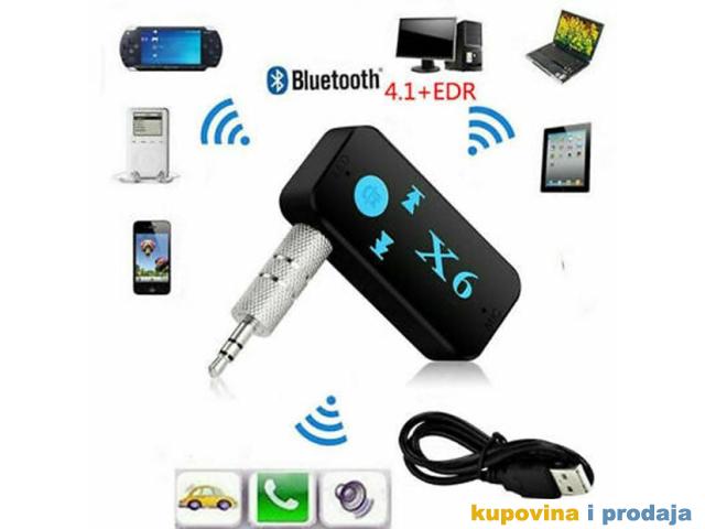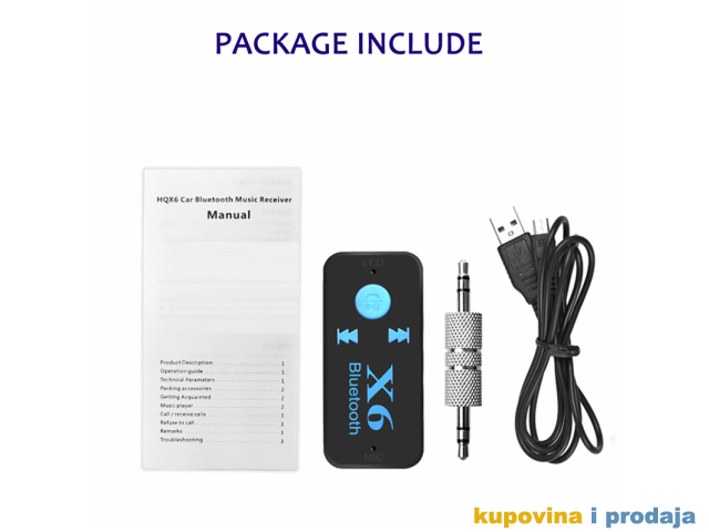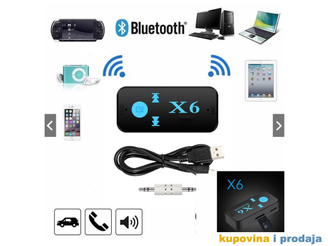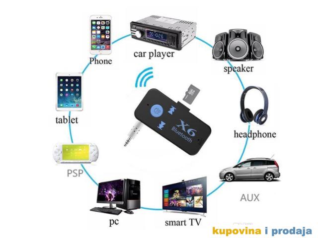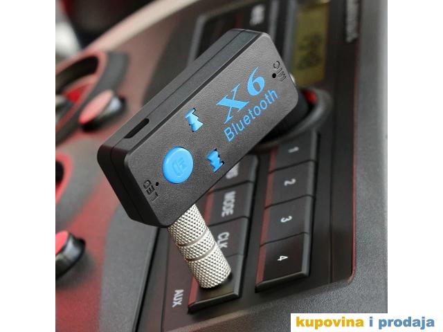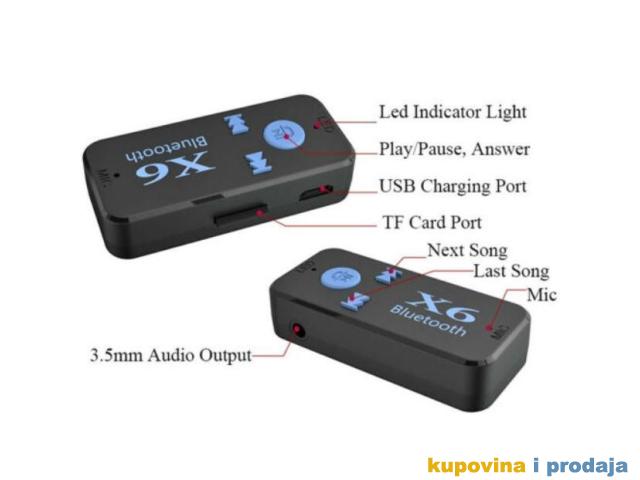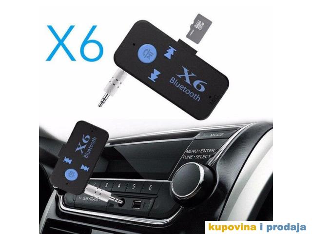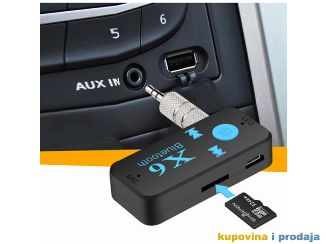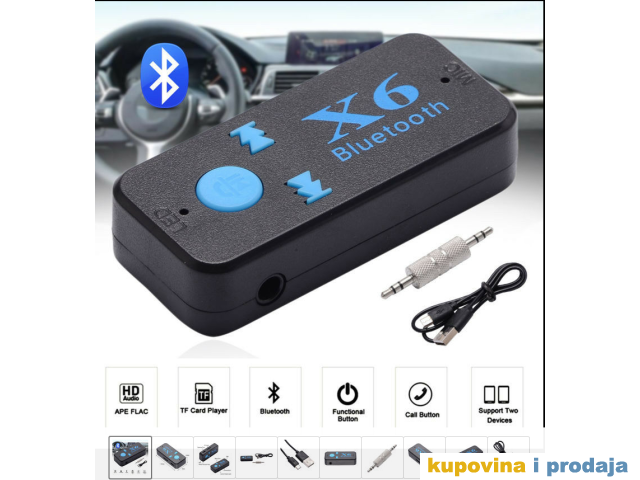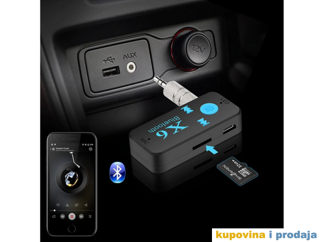 X6 automobil Bluetooth muzički prijemnik (hands-free) je bežični proizvod visoke tehnologije koji može da prima muziku na mobilnom telefonu ili TF kartici ili Bluetooth predajniku.