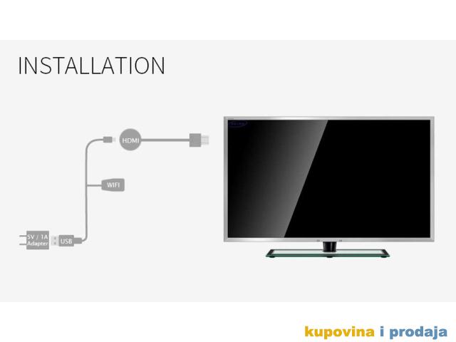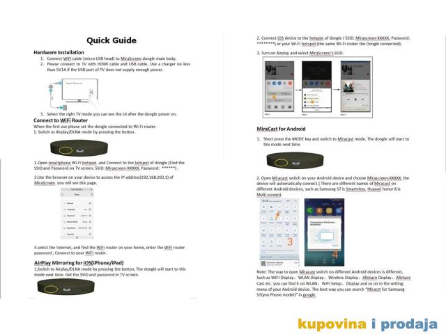 1. Povežite HDMI konektor MiraScreen G2 sa HDTV-om ili projektorom2. Povežite se sa kompatibilnog uređaja putem WiFi veze, a možete i da prikažete skoro svaki sadržaj sa kompatibilnog laptopa, tableta ili pametnog telefona3. Povežite USB utikač sa 5V / 1A adapterom za napajanje