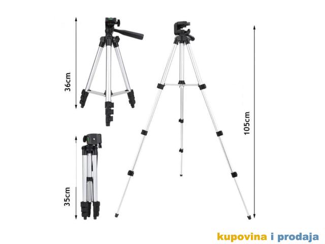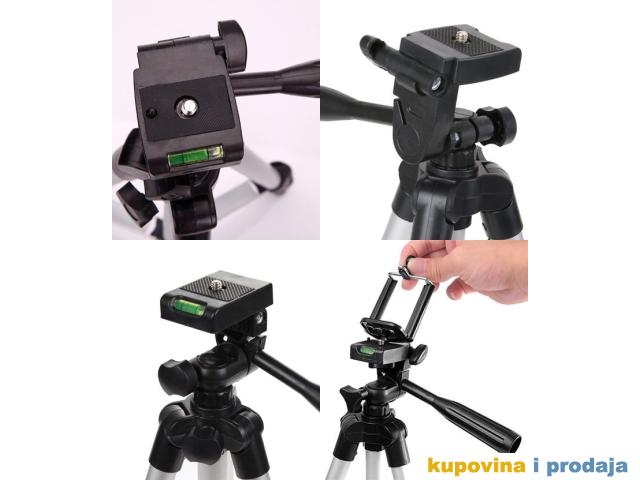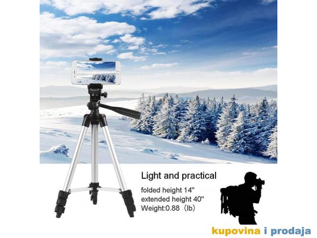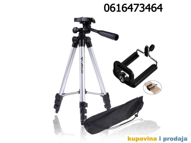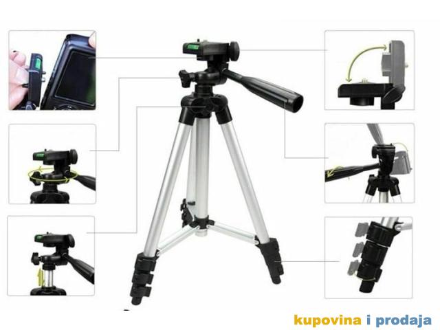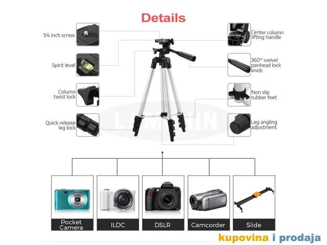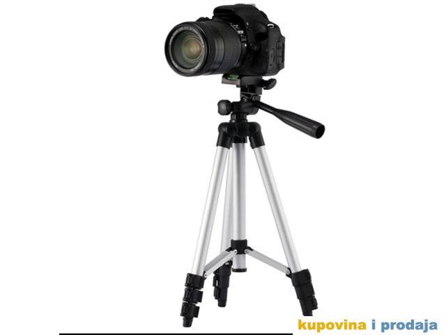 Ovaj tripod moze se koristiti za slikanje, snimanje video zapisa itd, sa trostrano pokretnom glavom i pločicom. Sa ručicom za kontinualno podešavanje visine centralnog stuba.
