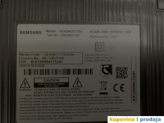 Prodajem Samsung tv,smart 4K UHD, 43(108 cm)crne boje,model UE43RU7172U.Tv je kao nov,u odlicnom stanju i u garanciji do 04.03.2022 godine.Kupljen je u Srbiji ,u radnji za koji postoji fiskalni racun,sa garancijom!Cena 200 evra.