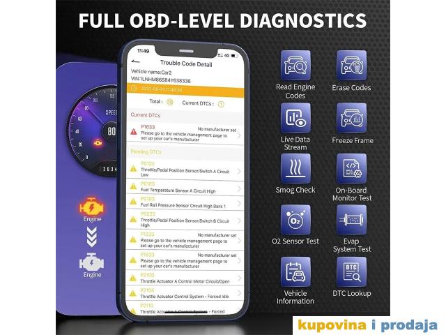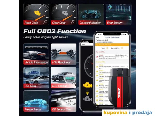 Pune OBD2 funkcije : Ne samo da precizno odredi kodove i moguće uzroke, već i izvrši DTC pretragu, test O2 senzora, I/M spremnost, test ugrađenog monitora, čitanje toka podataka, prikaz podataka zamrznutog okvira, test EVAP sistema, preuzimanje informacija o vozilu broj (VIN) i generirati dijagnostičke izvještaje.