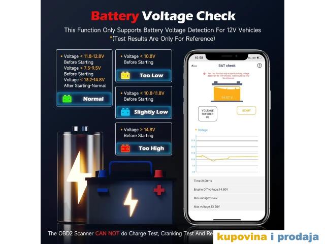 baterije Provjera : obd2 skener može utvrditi stanje akumulatora 12-voltnih vozila. Prikazuje promjenu startnog napona tokom određenog vremenskog perioda u grafičkom obliku i također vam daje napon kada je motor isključen, kao i minimalni i maksimalni napon.