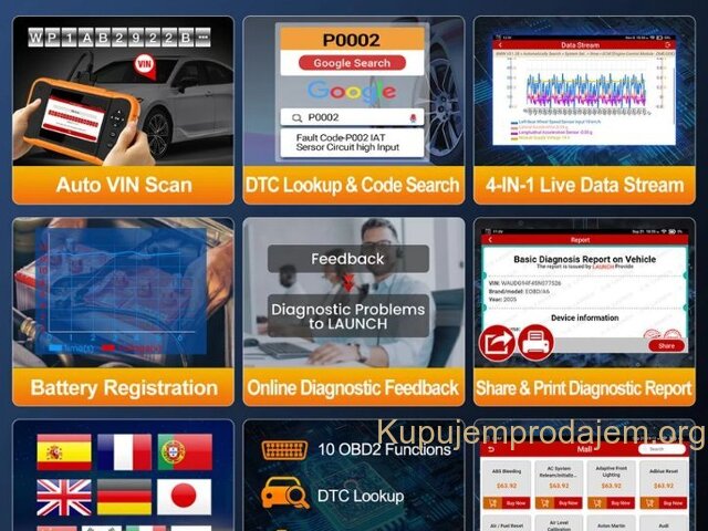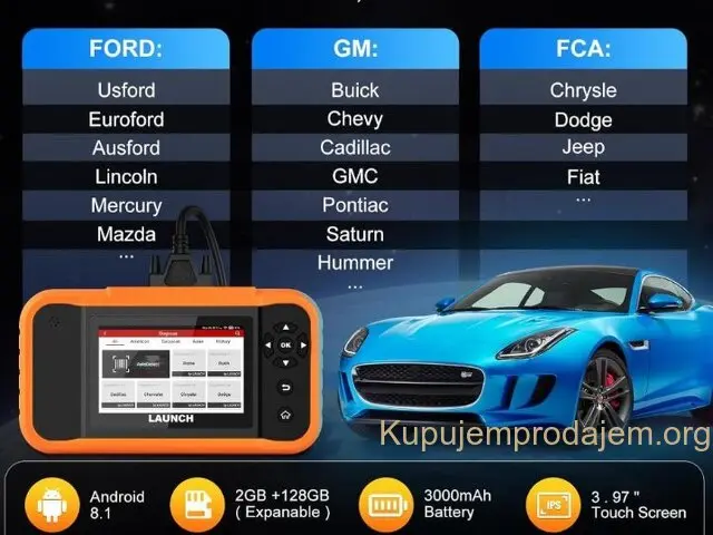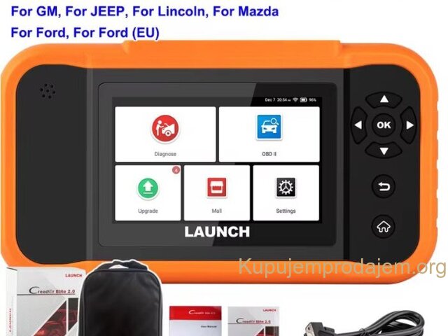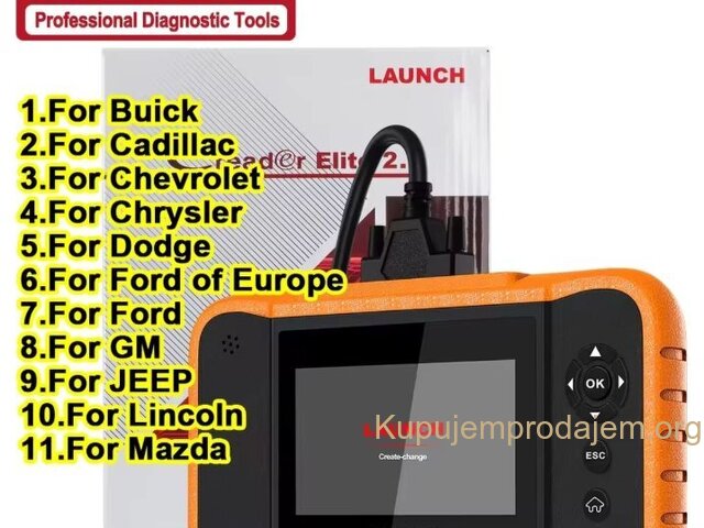 NOVO -LAUNCH X431 Creader Elite 2.0 OBD2 Ford GM Chrysler Full Systems ECU Coding Bi-directional Control 31+ Service LAUNCH X431 Creader Elite V2.0 FGC za 3 brenda:  za GM + za Ford + za Chrysler  podržava jezike engleski, francuski, španski, nemački, italijanski, ruski, portugalski, korejski, japanski, poljski, tradicionalni kineski LAUNCH X431 Creader Elite V2.0 FGC podržava sve funkcije dijagnostike sistema Svi sistemi uključujući: ABS sistem, sistem motora, SAS sistem, TPMS sistem, IMMO sistem, sistem baterija, sistem za servis ulja, SRS sistem, DPF sistem, sistem klimatizacije, sistem menjača. . . Kompletna dijagnostička funkcija: --čitanje kodova grešaka:   --brisanje kodova grešaka:   --preuzimanje informacija o ECU-u:   --grafičko prikazivanje toka podataka uživo:   stanje vozila --zamrznuti prikaz:   --Informacije o vozilu:   --Onlajn i oflajn ECU kodiranje:   --Aktivni tester (dvosmerna kontrola): --Specijalna funkcija: više od 31+ funkcija resetovanja, kao što je resetovanje vazdušnih jastuka, podešavanje AF, resetovanje DPF-a. . .   LAUNCH X431 Creader Elite V2.0 za FGC Supports Online &Offline ECU Coding: Napredna funkcija kodiranja se koristi za reflešovanje kontrolnih modula vozila, što vam omogućava da ažurirate softver računara na vozilu na najnoviju verziju, kao i da reprogramirate adaptivne podatke za određene komponente nakon popravki ili zamene, pružajući rešenja za probleme vožnje, efikasnosti goriva, gubitka snage, kodova grešaka, izdržljivosti mehaničkih delova itd.   Ali imajte na umu da ECU kodovi NISU univerzalni za sva vozila. Podržava svih 10 OBD2 funkcija Ovaj skener podržava svih 10 režima testiranja za OBD-II automobile, što je odlično za svakodnevne popravke. Tabela ispod opisuje svrhu svakog režima rada: 1. Čitanje kodova: Prikazuje detaljan opis dijagnostičkog koda greške (DTC) 2. Brisanje kodova i resetovanje: Isključuje lampicu za proveru motora (MIL), briše kodove i resetuje monitore. 3. Tok podataka: Čita i prikazuje uživo tok podataka ECU/PCM, grafički prikazuje funkcije i čuva podatke zamrznutog kadra. 4. Status spremnosti I/M: Pokazuje da li različiti sistemi vezani za emisije na vozilu ispravno rade i da li su spremni za inspekciju i testiranje održavanja. 5. Čitanje toka podataka uživo: Prikaz informacija o kontinuiranom toku podataka iz vozila u grafičkom prikazu uživo (talasni oblik). 6. Pregled podataka zamrznutog kadra: Proverite određena stanja vozila koja je zabeležio bordni računar u trenutku kada se pojavi kvar vezan za emisiju. 7. Test O2 senzora: Omogućava preuzimanje i pregled rezultata testa monitora O2 senzora za najnovije izvršene testove sa bordnog računara vozila. 8. Test bordnog monitora: Preuzima i prikazuje rezultate testova za komponente i sisteme pogonskog sklopa vezane za emisiju. 9. Očitavanje informacija o vozilu: Prikaz informacija kao što su VIN (identifikacioni broj vozila), CID (ID kalibracije) i CVN (broj za verifikaciju kalibracije), itd. 10. Test komponenti: Određene komponente vozila mogu se aktivirati komandama poslatim sa skenera kako bi se testirala njihova operativnost. LAUNCH X431 Creader Elite V2.0 FGC podržava 31+ uslugu resetovanja: 1. Resetovanje SAS sistema 2. Kodiranje injektora 3. IMMO sistem 4. Regeneracija DPF sistema 5. Ponovno učenje klima uređaja 6. Odvod vazduha ABS sistema 7. Resetovanje AdBlue sistema 8. Podešavanje gasa 9. Resetovanje TPMS sistema 10. Resetovanje guma 11. Resetovanje AFS farova 12. Inicijalizacija šiber krova 13. Resetovanje baterije 14. Kalibracija sedišta 15. Resetovanje ulja 16. Resetovanje klima uređaja: 17. UČENJE MENJAČA 18. Režim transporta 19. Kalibracija Windows sistema 20. Promena jezika 21. Resetovanje vešanja 22. Resetovanje NOx senzora 23. Resetovanje stop/start sistema 24. Odvod vazduha rashladne tečnosti 25. Resetovanje kočnica 26. Učenje brzina   POKRENITE X431 Creader Elite V2.0 FGC ažuriranje i servis Ažuriranje putem bežičnog interneta: Doživotno besplatno ažuriranje za dijagnostičku funkciju + funkciju resetovanja Launch X431 Creader Elite V2.0 FGC Parametar • Veličina ekrana: 4 inča osetljiv na dodir • Rezolucija: 480*800 piksela • CPU: 4-jezgarni procesor od 1,3 GHz • RAM: 2 GB • ROM: 16 GB Baterija: 3000 mAh • WiFi: 802.11b/g/n 2,4 GHz • USB: TYPE-C