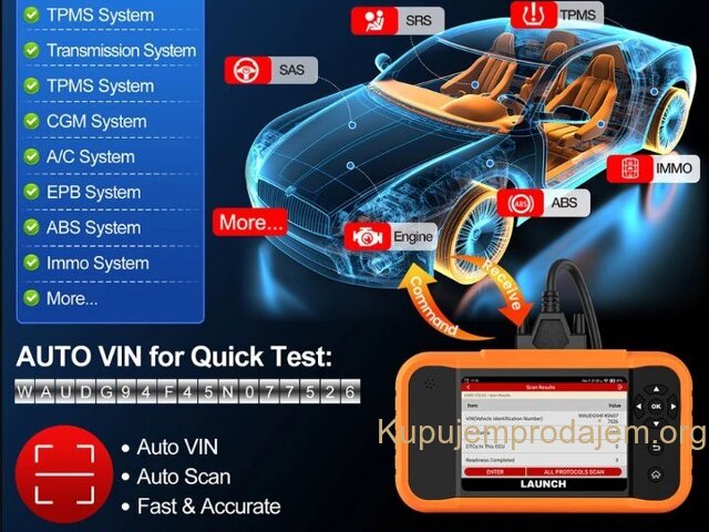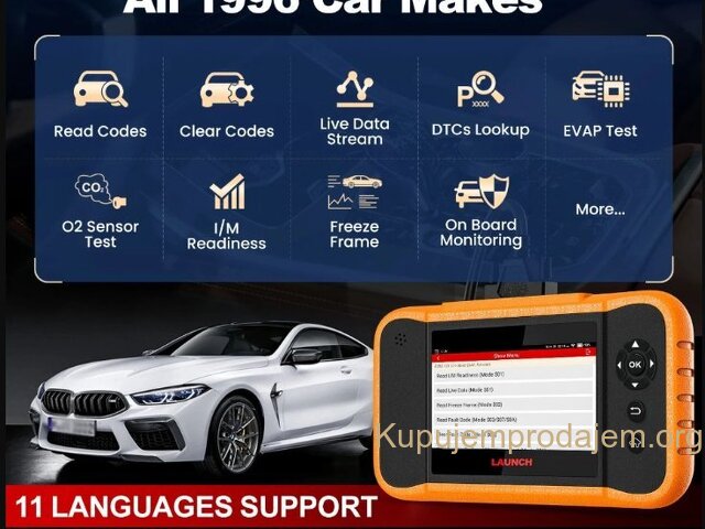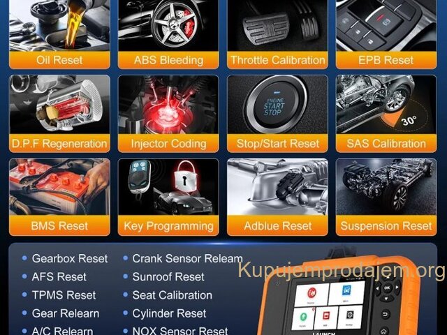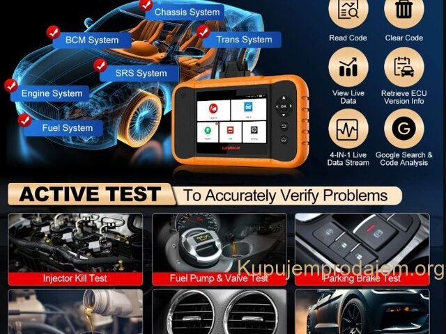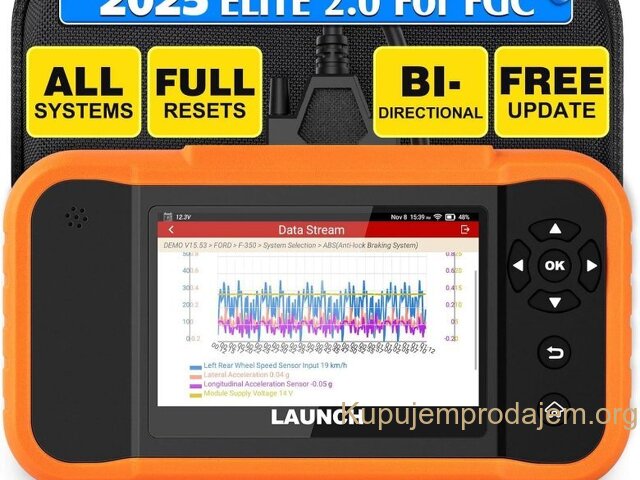 NOVO -LAUNCH X431 Creader Elite 2.0 OBD2 Ford GM Chrysler Full Systems ECU Coding Bi-directional Control 31+ Service LAUNCH X431 Creader Elite V2.0 FGC za 3 brenda:  za GM + za Ford + za Chrysler  podržava jezike engleski, francuski, španski, nemački, italijanski, ruski, portugalski, korejski, japanski, poljski, tradicionalni kineski LAUNCH X431 Creader Elite V2.0 FGC podržava sve funkcije dijagnostike sistema Svi sistemi uključujući: ABS sistem, sistem motora, SAS sistem, TPMS sistem, IMMO sistem, sistem baterija, sistem za servis ulja, SRS sistem, DPF sistem, sistem klimatizacije, sistem menjača. . . Kompletna dijagnostička funkcija: --čitanje kodova grešaka:   --brisanje kodova grešaka:   --preuzimanje informacija o ECU-u:   --grafičko prikazivanje toka podataka uživo:   stanje vozila --zamrznuti prikaz:   --Informacije o vozilu:   --Onlajn i oflajn ECU kodiranje:   --Aktivni tester (dvosmerna kontrola): --Specijalna funkcija: više od 31+ funkcija resetovanja, kao što je resetovanje vazdušnih jastuka, podešavanje AF, resetovanje DPF-a. . .   LAUNCH X431 Creader Elite V2.0 za FGC Supports Online &Offline ECU Coding: Napredna funkcija kodiranja se koristi za reflešovanje kontrolnih modula vozila, što vam omogućava da ažurirate softver računara na vozilu na najnoviju verziju, kao i da reprogramirate adaptivne podatke za određene komponente nakon popravki ili zamene, pružajući rešenja za probleme vožnje, efikasnosti goriva, gubitka snage, kodova grešaka, izdržljivosti mehaničkih delova itd.   Ali imajte na umu da ECU kodovi NISU univerzalni za sva vozila. Podržava svih 10 OBD2 funkcija Ovaj skener podržava svih 10 režima testiranja za OBD-II automobile, što je odlično za svakodnevne popravke. Tabela ispod opisuje svrhu svakog režima rada: 1. Čitanje kodova: Prikazuje detaljan opis dijagnostičkog koda greške (DTC) 2. Brisanje kodova i resetovanje: Isključuje lampicu za proveru motora (MIL), briše kodove i resetuje monitore. 3. Tok podataka: Čita i prikazuje uživo tok podataka ECU/PCM, grafički prikazuje funkcije i čuva podatke zamrznutog kadra. 4. Status spremnosti I/M: Pokazuje da li različiti sistemi vezani za emisije na vozilu ispravno rade i da li su spremni za inspekciju i testiranje održavanja. 5. Čitanje toka podataka uživo: Prikaz informacija o kontinuiranom toku podataka iz vozila u grafičkom prikazu uživo (talasni oblik). 6. Pregled podataka zamrznutog kadra: Proverite određena stanja vozila koja je zabeležio bordni računar u trenutku kada se pojavi kvar vezan za emisiju. 7. Test O2 senzora: Omogućava preuzimanje i pregled rezultata testa monitora O2 senzora za najnovije izvršene testove sa bordnog računara vozila. 8. Test bordnog monitora: Preuzima i prikazuje rezultate testova za komponente i sisteme pogonskog sklopa vezane za emisiju. 9. Očitavanje informacija o vozilu: Prikaz informacija kao što su VIN (identifikacioni broj vozila), CID (ID kalibracije) i CVN (broj za verifikaciju kalibracije), itd. 10. Test komponenti: Određene komponente vozila mogu se aktivirati komandama poslatim sa skenera kako bi se testirala njihova operativnost. LAUNCH X431 Creader Elite V2.0 FGC podržava 31+ uslugu resetovanja: 1. Resetovanje SAS sistema 2. Kodiranje injektora 3. IMMO sistem 4. Regeneracija DPF sistema 5. Ponovno učenje klima uređaja 6. Odvod vazduha ABS sistema 7. Resetovanje AdBlue sistema 8. Podešavanje gasa 9. Resetovanje TPMS sistema 10. Resetovanje guma 11. Resetovanje AFS farova 12. Inicijalizacija šiber krova 13. Resetovanje baterije 14. Kalibracija sedišta 15. Resetovanje ulja 16. Resetovanje klima uređaja: 17. UČENJE MENJAČA 18. Režim transporta 19. Kalibracija Windows sistema 20. Promena jezika 21. Resetovanje vešanja 22. Resetovanje NOx senzora 23. Resetovanje stop/start sistema 24. Odvod vazduha rashladne tečnosti 25. Resetovanje kočnica 26. Učenje brzina   POKRENITE X431 Creader Elite V2.0 FGC ažuriranje i servis Ažuriranje putem bežičnog interneta: Doživotno besplatno ažuriranje za dijagnostičku funkciju + funkciju resetovanja Launch X431 Creader Elite V2.0 FGC Parametar • Veličina ekrana: 4 inča osetljiv na dodir • Rezolucija: 480*800 piksela • CPU: 4-jezgarni procesor od 1,3 GHz • RAM: 2 GB • ROM: 16 GB Baterija: 3000 mAh • WiFi: 802.11b/g/n 2,4 GHz • USB: TYPE-C Pročitajte više