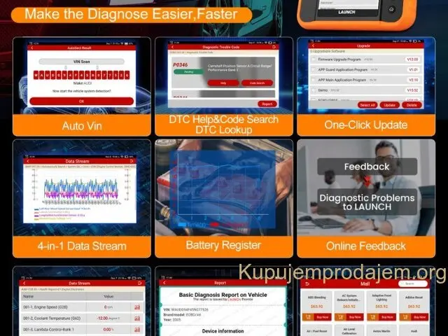 Novo - LAUNCH X431 Creader Elite V2.0 OBD2 za Renault i Dacia ECU Coding LAUNCH X431 Elite 2.0 Dizajniran posebno za Reno i Dačiju, alati za dijagnostiku svih sistema automobila, kodiranje ECU-a, dvosmerno testiranje, sva resetovanja, automatsko skeniranje VIN-a, doživotno besplatno ažuriranje. LAUNCH X431 Elite 2.0 OBD2 skener za Reno i Dačiju, opremljen naprednim Android 8.1 operativnim sistemom i 3,98" ekranom osetljivim na dodir, koji brzo pokreće sistem kako bi proces dijagnostike bio glatkiji. Takođe je bogat funkcijama, podržan za OE dijagnostiku svih sistema, uslugu resetovanja svih sistema, moćnu dvosmernu kontrolu, 10 OBD2 funkcija, automatsko skeniranje VIN-a. . . PODRŽANO 11 JEZIKA Engleski, francuski, španski, nemački, ruski, italijanski, portugalski, japanski, korejski, poljski, tradicionalni kineski LAUNCH X431 Elite 2.0 Pro čitač kodova za Reno i Dačiju, pruža vam sveobuhvatnu i detaljnu dijagnostiku za sve dostupne module, brzo identifikuje kvarove vozila. Ovaj profesionalni dijagnostički skener takođe može da čita/briše kodove, pregleda prenos podataka uživo i zamrzne sliku, čita informacije o ECU-u, obavlja posebne funkcije i aktivno testiranje kako bi bezbedno i efikasno održavao sisteme automobila. LAUNCH X431 Creader Elite 2.0 za Renault: Veličina ekrana: 4-inčni ekran osetljiv na dodir Rezolucija: 480*800 piksela CP: 4-jezgarni procesor od 1,3 GHz Baterija: 3000 mAh Android: 8.1 verzija RAM: 2 GB ROM: 16 GB WiFi: 2,4 GHz USB: TYPE-C/73,5 cm OBD II opseg ulaznog napona: 9~18 V Napajanje putem: DC 5 V kabla za prenos podataka ili dijagnostičkog kabla preko veze sa DLC-om vozila. Ovaj skener podržava svih 10 testnih načina za OBD-II automobile, što je odlično za svakodnevne popravke. 1. Čitanje kodova: 2. Brisanje kodova i resetovanje: 3. Tok podataka: 4. Status spremnosti I/M: 5. Čitanje toka podataka uživo: 6. Pregled podataka zamrznutog okvira: 7. Test O2 senzora: 8. Test ugrađenog monitora: 9. Čitanje informacija o vozilu: 10. Test komponenti: Sve funkcije održavanja, maksimizirajte svoju efikasnost i profitabilnost pomoću našeg sve-u-jednom dijagnostičkog alata. Napomena: * Ne podržavaju svi modeli sve funkcije resetovanja * Sve posebne funkcije su besplatne, nema potrebe da kupujete bilo kakve posebne funkcije. * Posebne funkcije se nalaze na ekranu za dijagnostiku, evo putanje do pronalaženja svih besplatnih funkcija: Izaberite Dijagnostika > Izaberite Model automobila, Godinu > Pokrenite Autovin > Izaberite Modul > Posebne funkcije! 1. Odzračivanje ABS-a: 2. Resetovanje lampice za ulje: 3. Resetovanje SAS-a: 4. Resetovanje injektora (Kodiranje injektora): 5. Resetovanje TPMS-a: 6. Resetovanje EPB-a (Resetovanje elektronske parkirne kočnice): 7. Učenje prenosa: 8. Kalibracija gasa: 9. Resetovanje AFS-a: 10. Inicijalizacija krovnog otvora 11. Adaptacija E-G-R sistema 12. Adaptivno učenje senzora položaja radilice/bregaste osovine 13. Regeneracija D-P-F sečiva 14. Kalibracija visine vazdušnog vešanja 15. Usklađivanje baterije 16. Kalibracija sedišta 17. Kalibracija prozora vrata 18. Kalibracija visine 19. Učenje adaptacije menjača 20. Resetovanje SRS sistema 21. Ponovno učenje senzora pritiska u kućištu radilice 22. Očitavanje/podešavanje kodova ubrizgavača 23. Resetovanje kompresora klima uređaja 24. Režim transporta 25. Ciklus samoučenja 26. Resetovanje stop/start sistema 27. Podešavanje CO u praznom hodu 28. Učenje položaja menjača 29. Resetovanje guma 30. Kalibracija senzora birača brzina 31. Usklađivanje kvačila 32. Brisanje adaptivnih podataka 33. Inicijalizacija senzora za kišu 34. Provera nivoa tečnosti u izduvnim gasovima dizel motora 35. Inteligentni tempomat 36. Balans snage motora Praćenje 37. Kalibracija ugla motora 38. Regeneracija G-P-F 39. Ispuštanje rashladne tečnosti 40. Resetovanje NOx senzora 41. Resetovanje kvačila 42. Zamena motora 43. Očitavanje konfiguracije ECU-a 44. Inicijalizacija aktuatora HVAC-a 45. Okidači alarma 46. Resetovanje brojača ciklusa paljenja 47. Zapremina rezervoara za gorivo 48. Resetovanje multimedije i videa - 49. Resetovanje Adblue-a 50. Podešavanje mehatronike itd. Više funkcija stalno raste. . . Druga funkcija LAUNCH X431 Creader Elite V2.0 za Renault/Dacia Automatsko VIN skeniranje (pametna dijagnoza):