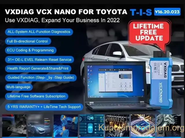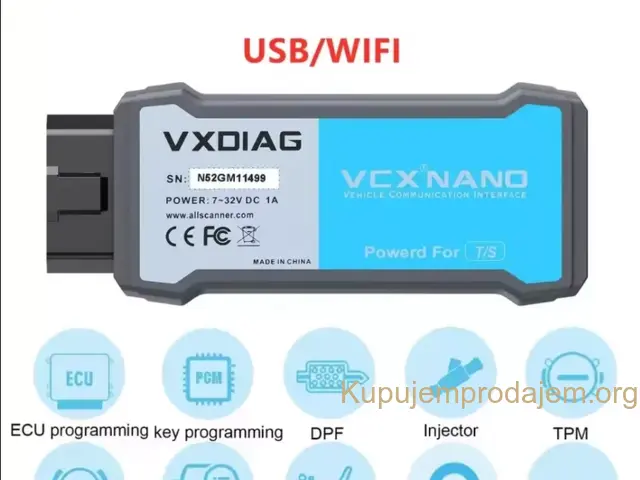 VXDIAG NANO NX400 Pro USB / WIFI Toyota Lexus OBD2 Podrška za programiranje i kodiranje ECU-a (ne nudi online račun). Alat za kompletnu dijagnostiku sistema. Podržava više specijalnih funkcija (resetovanje vazdušnih jastuka, EPB/SAS/BMS/TPMS/DPF i sl. ) Podržava aktivni test, automatsko čitanje VIN-a, čitanje i brisanje dijagnostičkog koda kvara, poput originalnog uređaja. Podrška za otključavanje skrivene funkcije, čitanje prenosa podataka uživo, čitanje zamrznutog okvira, ažuriranje sustava modula. Doživotna licenca, besplatna za ažuriranje licence. Podrška za J2534 protokol. Podrška za daljinsku dijagnostičku funkciju. Podržava USB i WIFI vezu. Uradite dijagnostiku sa originalnim softverom za TIS. Napomena: Ne podržavamo pružanje originalnog softvera, molimo vas da ga kupite legalnim kanalima. Dijagnostika svih sistema Dijagnosticka aplikacija omogućava povezivanje podataka sa elektronskim kontrolnim sistemom testnog vozila za dijagnostiku vozila. Aplikacija obavlja funkcionalne testove, preuzima dijagnostičke informacije vozila kao što su kodovi problema i događaja i živi podaci za različite upravljačke sisteme vozila, kao što su ABS, SRS, motor, mjenjač, ​​kočioni sistem, sistem emisije, sistem goriva, sistem svjetla, sistem brisača itd. *EPB (Electrical Park Brake system): *SAS (senzor ugla upravljanja): *TPMS (Sistem za praćenje pritiska u gumama): *ABS (Sistem protiv blokiranja kočnica) *ECU (elektronska kontrolna jedinica): *DPF regeneracija (filter za dizel čestice): *BMS (Sistem održavanja baterije): *ECU funkcija programiranja i kodiranja 1. Podrška VCX NANO skenera za programiranje ECU-a i popravljanje softverski kontroliranih performansi vožnje i problema s emisijom 2. Programiranje: možete preuzeti novu verziju softvera iz baze podataka servera na mreži i reprogramirati je na ECU. 3. Kodiranje: programski adaptivni podaci za upravljačke module automobila nakon popravke ili zamjene dijela vozila. 4. Podrška za online programiranje i kodiranje. Napomena: Ne pruzamo podršku za pružanje online naloga. *VCX NANO podržava J2534 protokol -Standardna OBD2 oprema za dijagnostiku automobila, podržava J2534 i ISO 2290 PDU protokole. *WIFI/USB veza -Uređaj treba da radi sa laptopom, možete povezati uređaj sa vašim laptopom putem USB kabla ili WIFI, Podržava WIFI i USB komunikaciju za prenos podataka vozila na laptop putem dijagnostičkog softvera. *Computer Windows sistemski zahtjevi -Podrška za rad na Windows 7 i Windows 10 sistemima (ne podržava Home sistem) *Besplatno ažuriranje licence i firmvera uređaja -Uređaj uključuje licencu, ne morate ponovo plaćati licencu, ako je isteklo vreme licence, možete ga direktno ažurirati u aplikaciji za drajver 'VX-Manager'. *VCX NANO Puna OBD2 funkcija 1. Čitanje kodova Prikažite detaljan opis dijagnostičkog koda kvara (DTC). 2. Brisanje kodova i resetovanje Isključuje lampicu Check Engine (MIL), briše kodove i resetuje monitore. 3. Tok podataka 4. I/M Status spremnosti Pokazuje da li različiti sistemi vezani za emisije na vozilu rade ispravno i da li su spremni za ispitivanje i testiranje održavanja. 5. Read Live Data Stream 6. Pregledajte podatke o zamrznutim okvirima 7.02 Test senzora 8. Test monitora na vozilu 9. Pročitajte informacije o vozilu Prikažite informacije kao što su VIN (Identifikacioni broj vozila), CID (ID kalibracije) i CVN (Broj za verifikaciju kalibracije) itd. 10. Testiranje komponenti Određene komponente vozila mogu se aktivirati naredbama koje šalje skener kako bi se testirala njihova operativnost. Jezici: Kineski, Engleski, francuski, italijanski, španski, nemački VCX NANO podržava razne posebne funkcije Za različite planirane servise i održavanje uključuju resetiranje svetla za održavanje, učenje gasa, učenje kuta upravljanja, resetovanje kočionih pločica, resetiranje pritiska u gumama, ABS izduv, usklađivanje baterije. učenje informacija o brzinama, kodiranje brizgaljki, regeneracija DPF-a, usklađivanje farova, učenje mjenjača, usklađivanje ovjesa , Inicijalizacija krovnog otvora, A/F podešavanje, elektronsko pokretanje pumpe, otpuštanje načina transporta, modifikacija guma, kalibracija vrata i prozora, resetovanje uree, resetovanje NOx, start-stop postavka, podešavanje jezika, kalibracija sedišta, kvar štitnika, itd. *Active Test **Auto Read VIN Paket sadrzi: 1 x VCX NANO NX400 Pro OBD2 uredjaj Link za skidanje softvera Pročitajte više