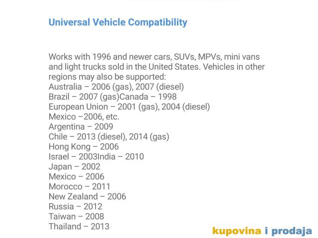 Vozila u drugim regijama koje su OBD II /EOBD/JOBD takođe mogu biti podržane (Kanada 1998. , Evropska unija - 2001. (benzin), 2004.   (dizel), Australija - 2006 (benzin), 2007 (dizel) itd. )