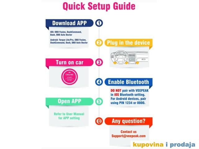2. Kada koristite sa iOS uređajima (iPhone ili iPad), nema potrebe i NEMOJ upariti sa "VEEPEAK" sa liste iOS Bluetooth uređaja.   Pokrenite aplikaciju, podesite konekciju i direktno se povežite iz aplikacije.   Ako ste pokušali da se uparite (što je rezultiralo greškom Nije podržano), ponovo pokrenite svoj iOS uređaj.