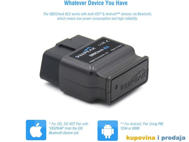 Za razliku od normalnih Bluetooth adaptera koji rade samo s Androidom, OBDCheck BLE takođe radi sa iOS uređajima preko Bluetooth LE (nije potrebno Bluetooth uparivanje).   Također je bolji od WiFi verzija s mnogo manjom potrošnjom energije, dok vam omogućava pristup internetu za druge aplikacije putem vaših mobilnih podataka bez složenih postavki.   Istovremeno se možete povezati i na Bluetooth u automobilu.