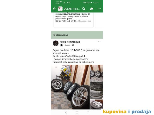 Na prodaju felne r15 4*100 7joti felne su u sta vise odličnom stanju gume solidne odgovarala bi zamena za neke druge felne r16 5*100 uz moju doplatu ili do moje cene za više informacija pozvati na broj