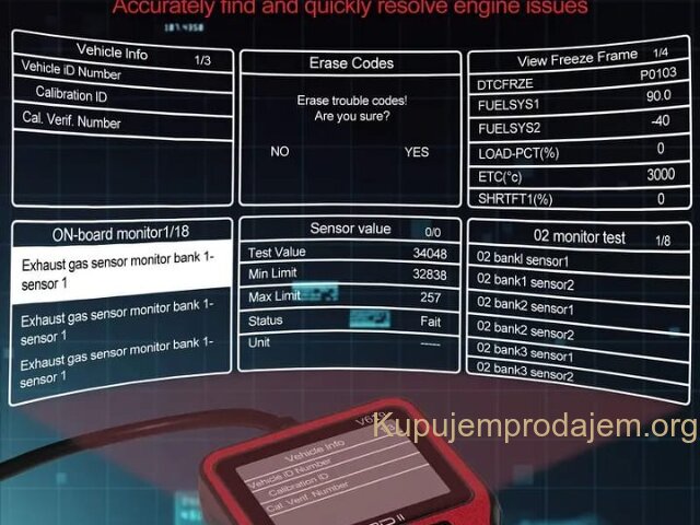 OBD2 čitač kodova ima ugrađenu biblioteku od 35901 OBD2 DTC za pretragu, kao profesionalni auto skener, ovaj OBD2 diagnostički alat će vam pomoći da utvrdite uzrok upaljenog indikatora motora, pročitati I/M spremnost, čitati i brisati kô de, indikator motora ili MIL, prikaz zamrznutih podataka, isključiti dobivanje VIN vozila, testovanje napona baterije, live stream podataka, test senzora 02, mod nadzora na vozilu i izvođenje testova komponenti itd