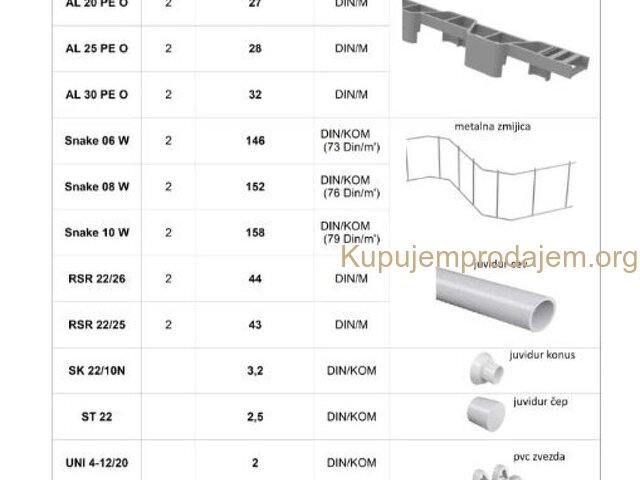 Direktna uvozna cena · Profesionalni proizvodi za armiranje i betoniranje Na lageru imamo široku ponudu građevinskih distancera EXTE (Nemačka) – visokokvalitetni distanceri za tačno definisanje armature u betonu. Proizvodi su sertifikovani, pouzdani, otporni na pritisak i vremenske uslove. Velike količine odmah dostupne, Brza isporuka na teritoriji Srbije, Popusti na veće količine i stalne kupce. KONTAKT: PRIMIP doo – Sremska Mitrovica Tel: 063/217-593 • 022/662-111 • 022/662-249 Email: primip@mts. rs Web: www. primip. rs Izdvajamo iz ponude, najtraženiji: AL 20 PE O / 2 m / 27 din/m / Linijski plastični distancer visine 2cm AL 25 PE O / 2 m / 28 din/m / Linijski plastični distancer visine 2,5cm AL 30 PE O / 2 m / 32 din/m / Linijski plastični distancer visine 3cm Snake 06 W / 2 m / 73 din/m / Metalna zmijica visine 6cm Snake 08 W / 2m / 76 din/m / Metalna zmijica visine 8cm Snake 10 W / 2m / 79 din/m / Metalna zmijica visine 10cm UNI 4-12/20 / 2 din/kom / PVC zvezda distancer, visine 2cm UNI 4-12/25 / 2,2 din/kom / PVC zvezda distancer, visine 2,5cm UNI 4-12/30 / 3 din/kom / PVC zvezda distancer, visine 3cm ASK 20 / 4 din/kom / PVC stub distancer, visine 2cm ASK 25 / 4,4 din/kom / PVC stub distancer, visine 2,5cm RSR 22/26 / 2 m / 44 din/m / Juvidur cev otvora 2,2cm, spoljneg prečnika 2,6cm RSR 22/25 / 2m / 43 din/m / Juvidur cev otvora 2,2cm, spoljneg prečnika 2,5cm SK 22 / 3,2 din/kom / Juvidur konus ST 22 / 2,5 din/kom / Juvidur čep