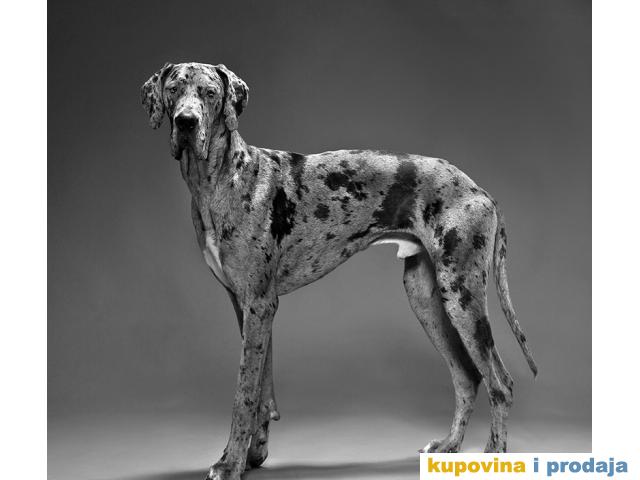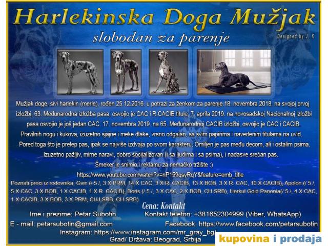 Mužjak doge, sivi harlekin (merle), rođen 25.12.2016. u potrazi za ženkom za parenje.18. novembra 2018. na svojoj prvoj