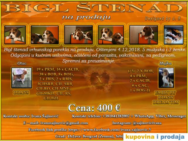 Bigl štenad vrhunskog porekla na prodaju. Oštenjeni 4.12.2018. 5 mužjaka i 3 ženke. Odgajani u kućnim uslovima, očišćeni od parazita, vakcinisani, sa pedigreom. Spremni za preuzimanje.