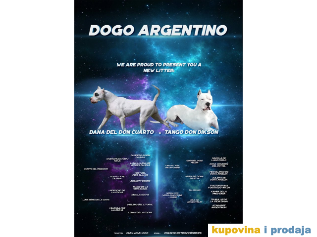 Argentinski Pas Dogo Štenad na prodaju. Vrhunska krvna linija radnih pasa. Jedan mužjak I tri ženke. Oštenjeni 18.07.2018. Profesionalno odnegovani. Štenad su očišćeni od parazita, vakcinisani i sa pedigreom.