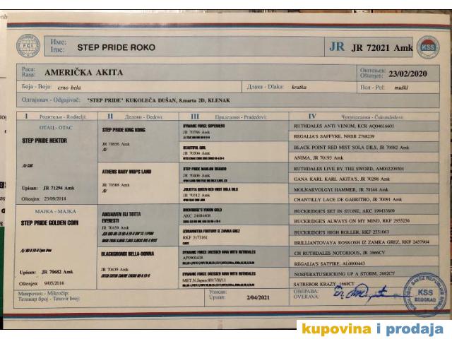Mužjak Američka Akita star tri godine, šampion Srbije, pobednik na nekoliko izložbi, slobodan za parenje.