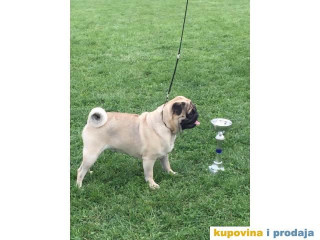 Prelep mlad mužijak rase Mops(Pug) šampionskog porekla spreman za parenje. Dobitnik je JrCHSRB, CHSRB, 4x CAC, 3x BOB