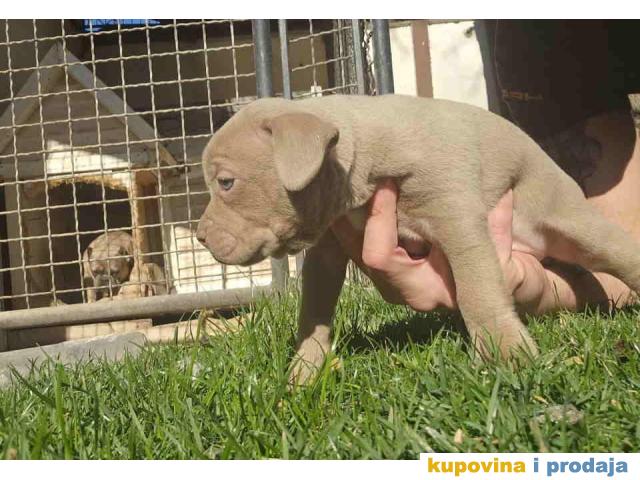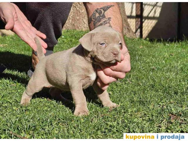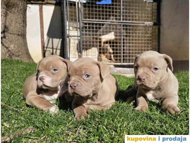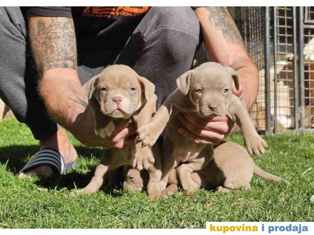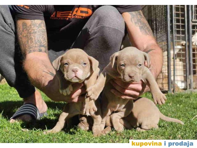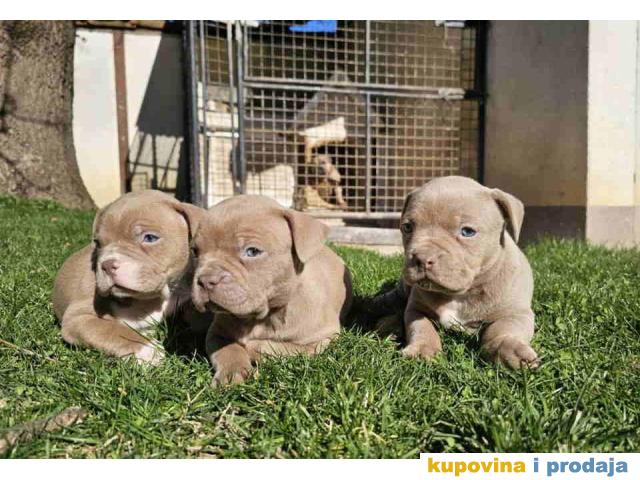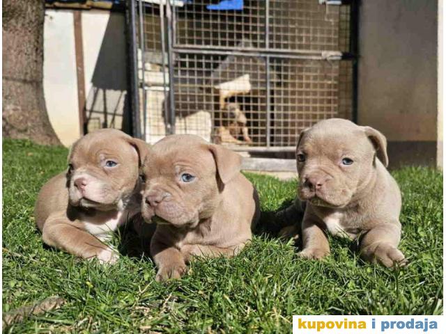 American bully exotic stenci u lilac (isabel) boji, mama i tata vrhunski primerci u tricolor boji, nisti, nabijeni, izuzetno misicavi. Stenci profesionalno odnegovani, vakcinisani, ocisceni od parazita. Poseduju ABKC pedigree