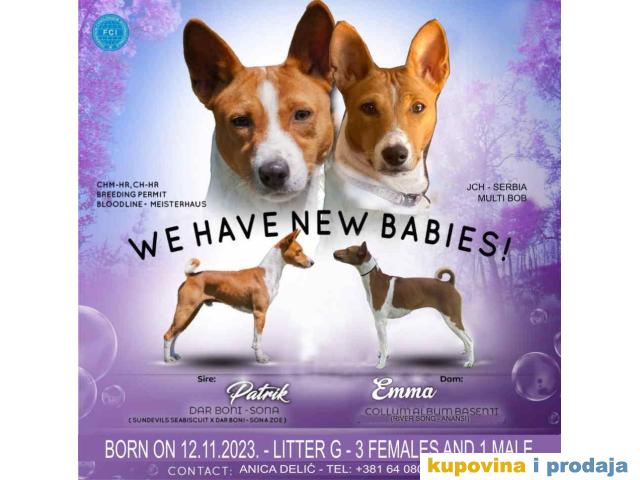 Basenji štenci na prodaju. Oštenjeni 12.11.2023. Dostupni 1 dečak i 3 devojčice. Urednih papira, šampionske krvi. Moguć transport po celoj Evropi. Za sve informacije, pišite nam na