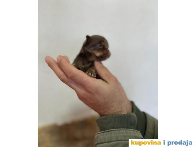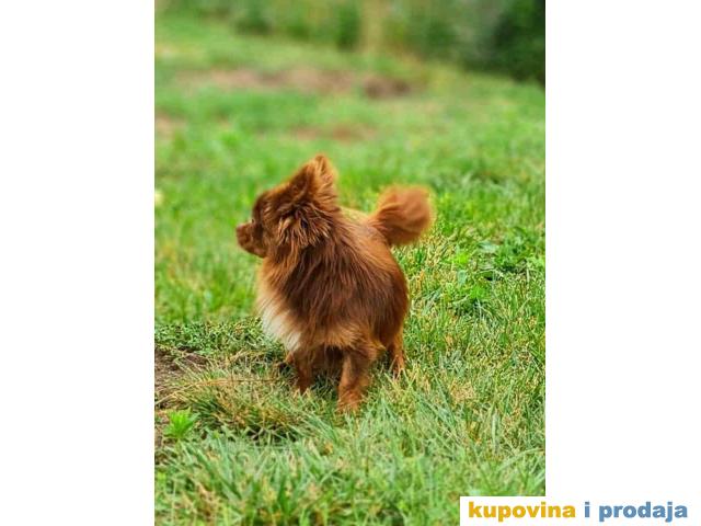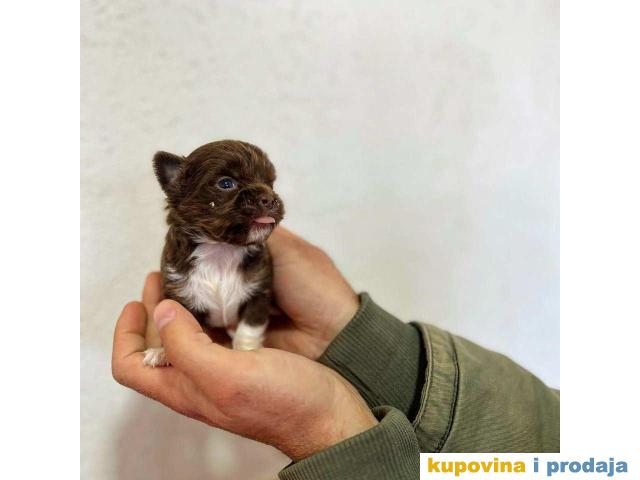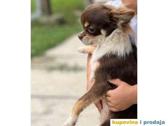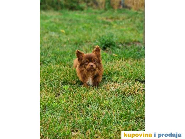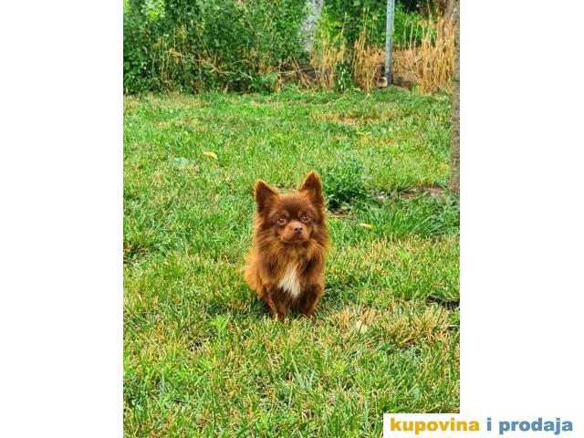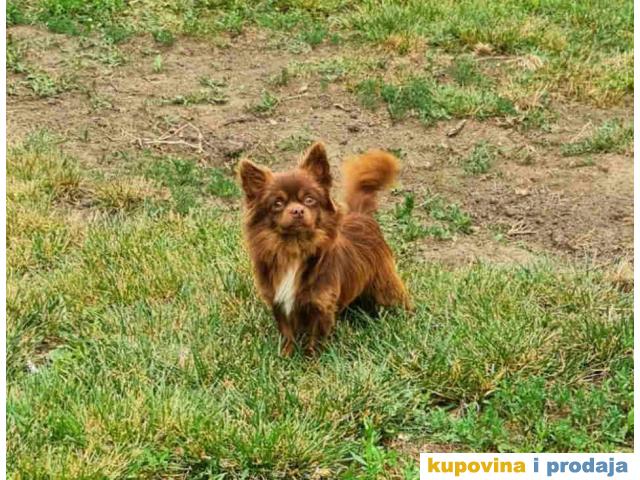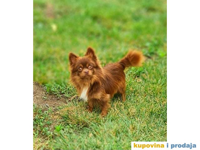Čivava dugodlaka čokoladni mužjak za parenje Mužjak dugodlake čokoladne čivave otvoren za parenje. Dokazan u priplodu. Težak 2.2kg. Beograd. Imamo i štence spremne za novi dom. Štenci od ovog psa na poslednjim slikama Miloš, Zemun/Beograd Viber,whatsapp. +38162562915