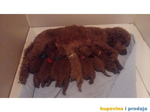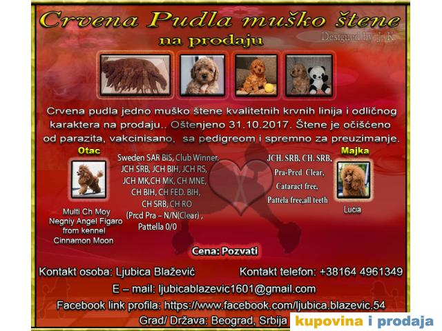 Crvena pudla jedno muško štene kvalitetnih krvnih linija i odličnog karaktera na prodaju. Oštenjeno 31.10.2017. Štene je očišćeno od parazita, vakcinisano, sa pedigreom i spremno za preuzimanje.