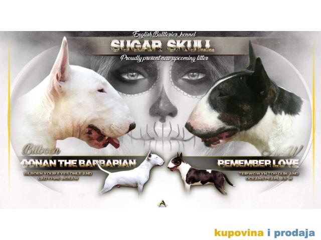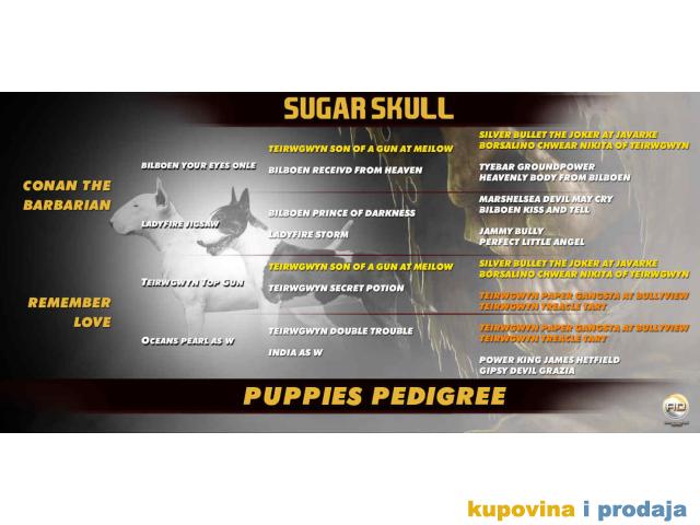 Ogajivacnica Bull Terijera "Sugar Skull" ima u ponudi dva decaka i jednu devojcicu, starosti 10 nedelja. Stenci su odlicnog porekla i vrhunske krvne linije "Teirwgwyn". Otac štenaca Inter. CH Bilboen Conan The Barbarian. Majka štenaca Remember Love AS-W. Ćerka CH Teirwgwyn Top Gun.
