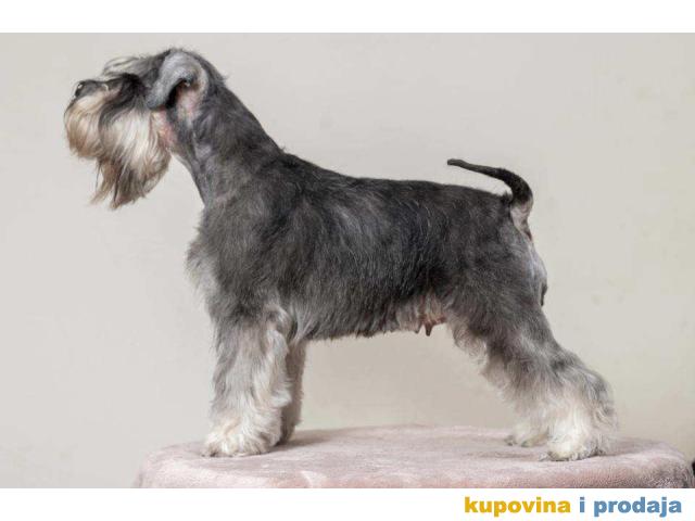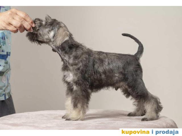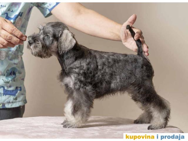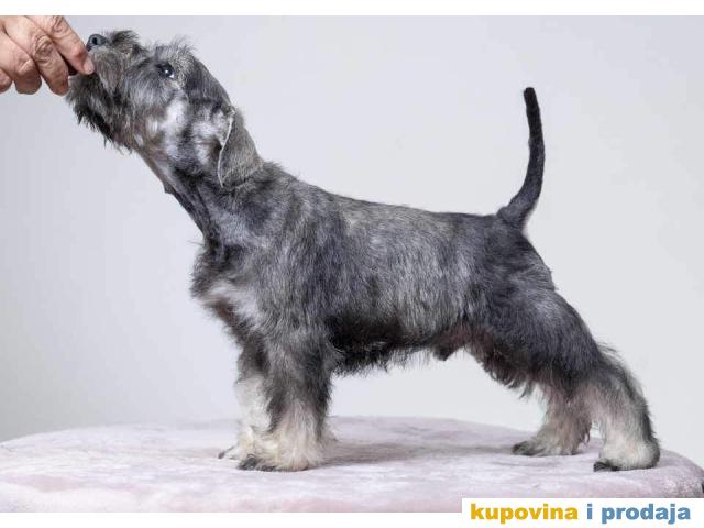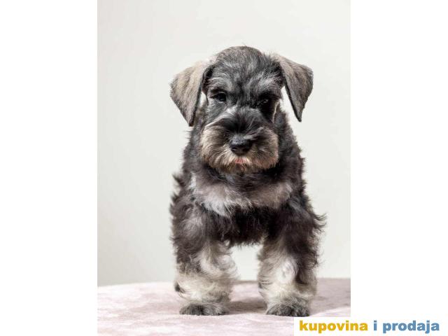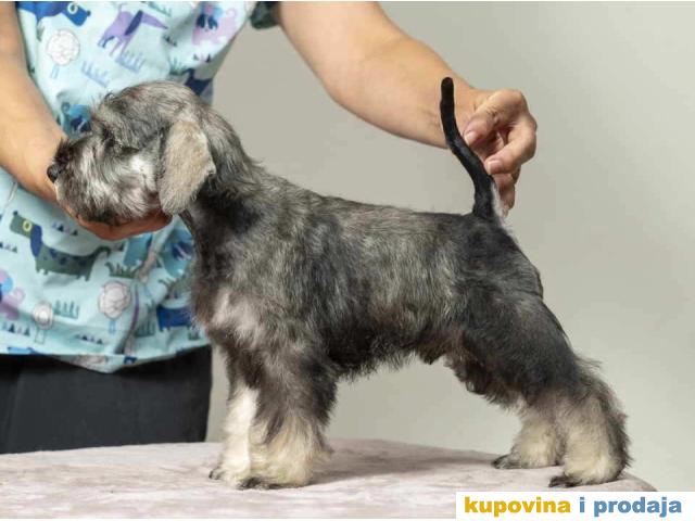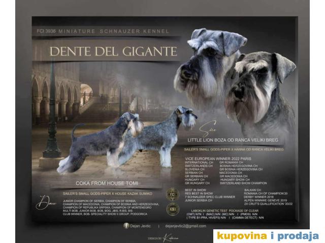 Na prodaju vrhunski štenci Patuljastog ŠNAUCERA Oštenjeni 26.04.2024. Otac: LITTLE LION BOZA OD RANCA VELIKI BREG - Vice European winner 2022 Paris, International CH, Switzerlands CH, Slovenia CH, Serbian CH, GR Serbian CH, Hungary CH, GR Hungary CH, GR Romania CH, Bosnia Herzegovina CH, Macedonia CH, GR Macedonia CH, Hungary Show CH, Switzerland Show Champion Best in show, Res Best in Show, 7 schnauzer spec slub winner, Junior Serbia CH, Balkan CH, Romania CH of champion 20, Derby winner 2018, Alpen winner Geneve 2019, 2xcruts Quallification 2022 Majka: COKA FROM HOUSE TOMI - Junior Champion of Serbia; Champion of Serbia, Macedonia, BiH, RS, Montenegro, Multi JBOB, BOB, BOG, JBIS, R.BIS, BIS; Club Winner; BOB – Speciality chow II FCI group, Podgorica Laboklin genetic test pockage of clear (CMT) N7N I (MAC) N/N (MC) N/N I (PMDS) N/N (TYPE B1-PRA, HIVEP3) N/N I (CAMMA DETECT) N/N Odgajivačnica: Dente del Gigante Dejan Jevtić , Beograd/Vračar Tel/Viber: + 38163416527