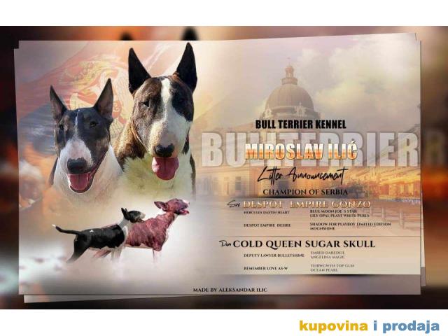 Standard Bull Terrier stenci na prodaju, ostenjeni 18.12.2023. Vrhunskog porekla, roditelji iz registrovanih odgajivačnica (Despot Empire i Sugar Skull). Prodaju se sa rodovnicima, sa svim primljenim vakcinama. viber, whats app: +381(0)69/078-50-58 miroslav.misel@yahoo.com Miroslav Ilić: Sremska Mitrovica/Mačvanska Mitrovica