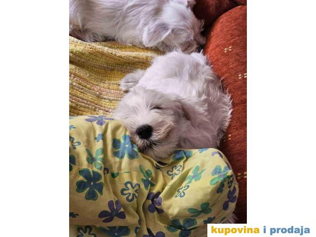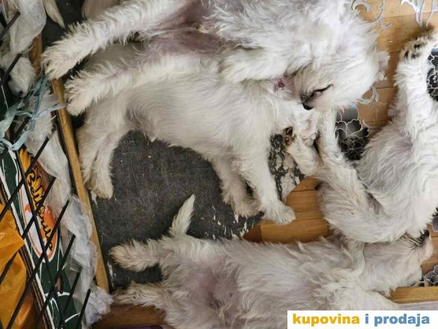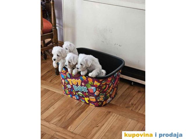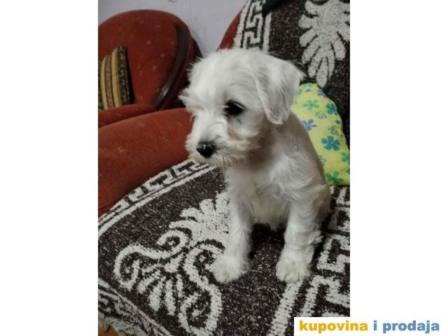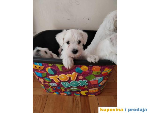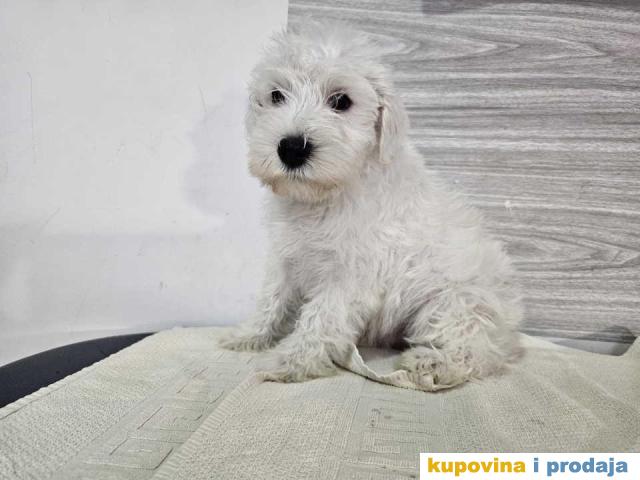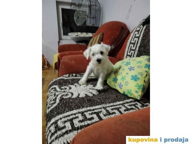 Štenci belog patuljastog šnaucera. Stari 2 meseca, vakcinisani. Sa papirima. Kucno leglo, odgajani unutra. Otac i majka ocenjeni. Otac sampionskog porekla.
