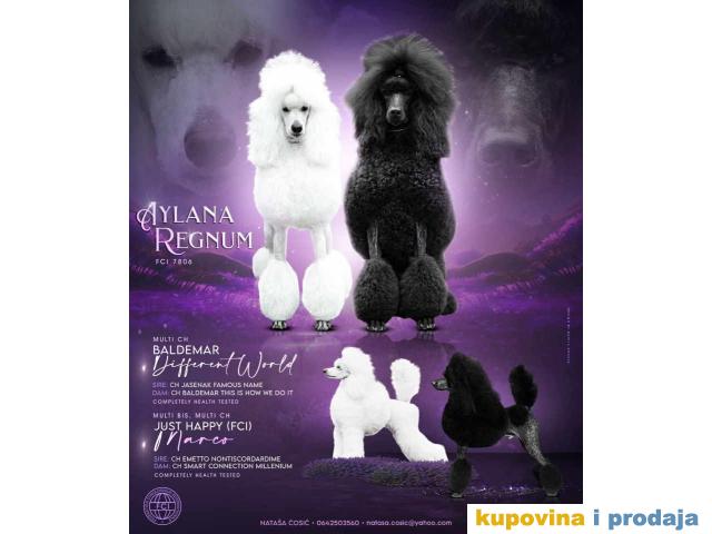 Štenci standard pudle od roditelja šampionskog porekla. Odg. Aylana Regnum. Roditelji imaju urađene genetske testove i snimke kukova i laktova Majka: Baldemar Different World Jch Srbije Ch Srbije Ch Makedonije Ch R. Srpske Ostvaren uslov za interšampiona Otac:Just Happy Marco : Jch Srbije Jch Mađarske Jch R. Srpske Ch Srbije Ch Makedonije Ch Mađarske Multi Best in show Oštenjeni: 07.april 2023. Redovno vakcinisani i čišćeni od parazita. Uz svu veterinarsku i kinološku dokumentaciju, uskoro spremni za preuzimanje. Za više informacija, javite se na viber, whatsapp na br. +381642503560 Messenger : Aylana Regnum Email: natasa.cosic@yahoo.com Nataša, Novi Sad