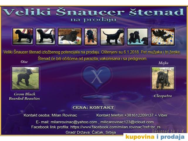 Veliki Šnaucer štenad izložbenog potencijala na prodaju. Oštenjeni su 6.1.2018. Pet mužjaka i tri ženke. Štenad će biti očišćena od parazita, vakcinisana i sa pedigreom.