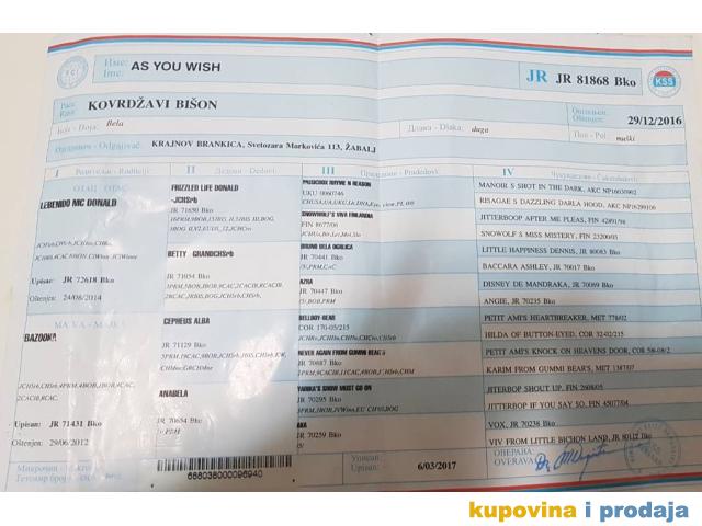 Vrhunski mužjak kovrdžavog bišona odličnog pedigrea i izuzetnog karaktera slobodan za parenje.  Izuzetne gradje, perfektan pigment, prelepe glave i dlake, zubalo odlično. Dokazan u priplodu, daje lepe i zdrave štence.  Vrlo negovan i voljen pas! As You Fish - Flok je veoma uspešan izložbeni primerak mužjaka - JChSRB, JChMKD, JChBUL, 2 x Junior RBIS, RBOG, 3 x BOG3