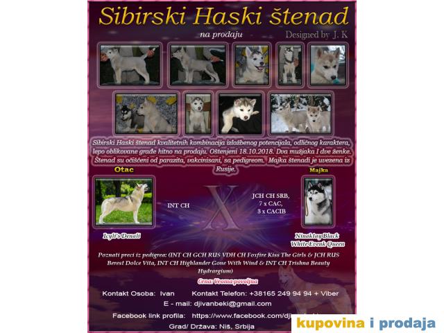 Sibirski Haski štenad kvalitetnih kombinacija izložbenog potencijala, odličnog karaktera, lepo oblikovane građe hitno na prodaju. Oštenjeni 18.10.2018. Dva mužjaka I dve ženke. Štenad su očišćeni od parazita, vakcinisani, sa pedigreom. Majka štenadi je uvezena iz Rusije.
