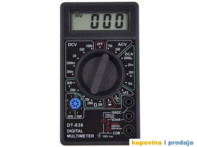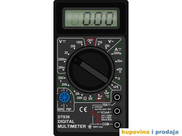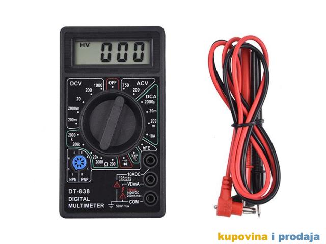 Мултиметар ДТ-838 може да се користи за мерење једносмерног напона, наизмјеничног напона, једносмерне струје, електричне отпорности, испитивања пн спојева, звучну индикацију повезаности, температуре и струјног појачања (хФЕ) биполарних транзистора. Код овог инструмента се опсег мерења подешава ручно.