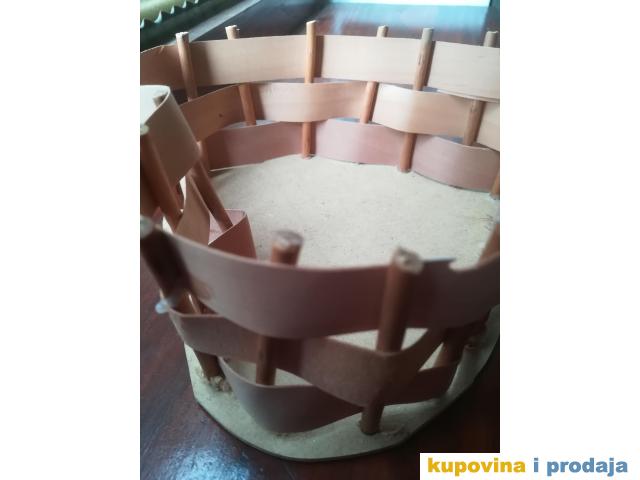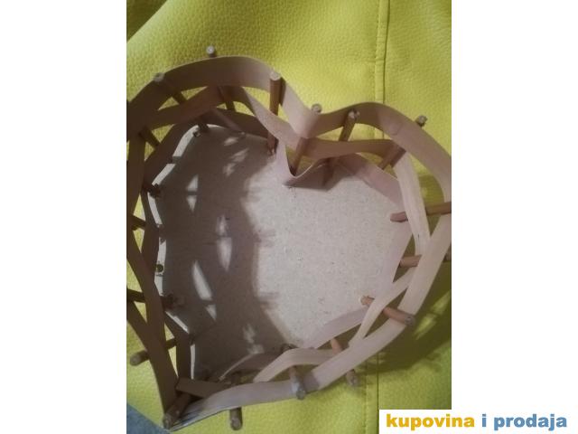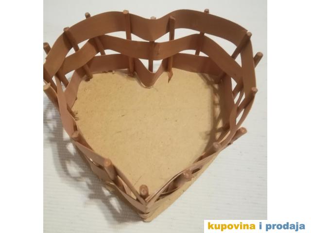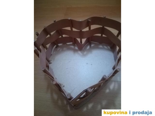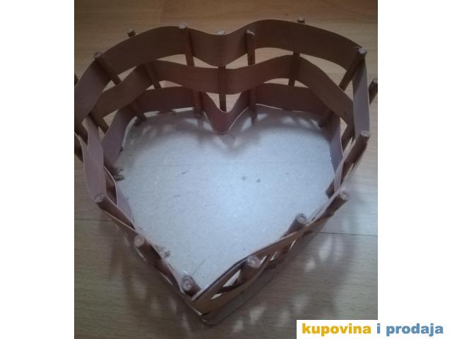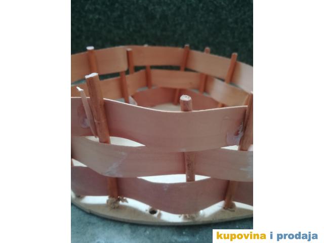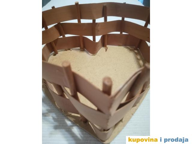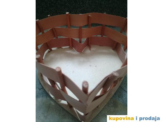 Korpa za razne dekoracije, cvetne, ili razne sitnice, donji deo od iverice, spoljni deo od tanke iverice, jednom korišćena, obim fi najširi deo 15 cm, dužina 15 cm, dubina 7 cm.