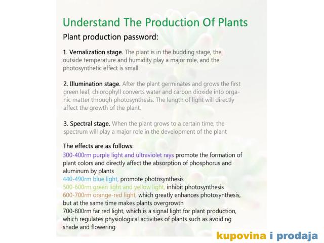 Uvaj uređaj daje rozikastu svetlost zbog crvenih UV svetlosnih ćelija na lampi, dok je deo ćelija plave boje. Plavo svetlo je dobro za fotosintezu, pomaže u indukciji hlorofila i karotenoida, koji su neophodni za zdravo lišće, crveno svetlo je najpogodnije za cvetanje i plodonošenje i ključno je za cvetanje biljaka. Uz ovu lampu biljka će oslobađati energiju i kiseonik kao da raste pod pravim suncem.