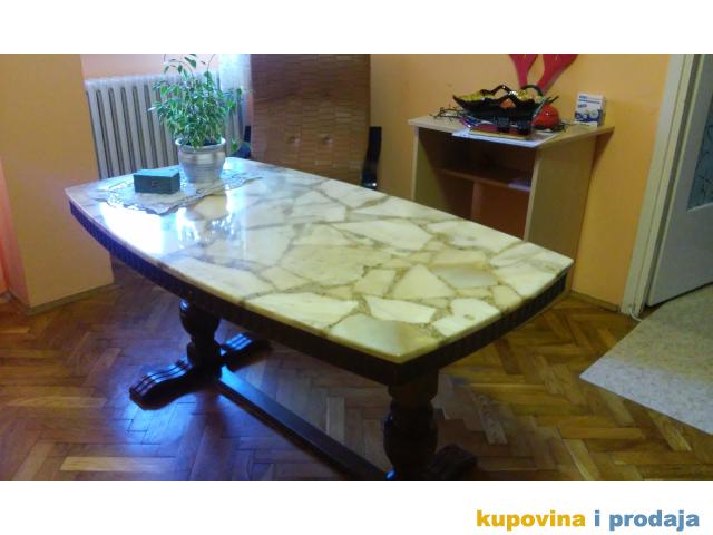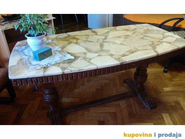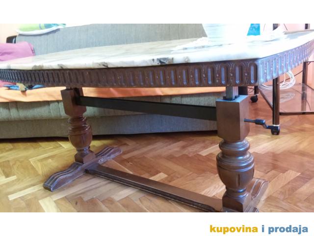Astal za dnevnu sobu, duž. 1,32m, visina je 65cm, mada na jednoj slici se vidi ručica koja služi da se visina može podesiti. otprilike oko 30cm više i niže. Širine 52,00cm, 75,00cm i 52,00 cm (s obzirom da je astal ovalni, širina se razlikuje). Ploča nije kamena, već neka legura, sve ostalo je drvo. Vrlo je masivan i težak, što odlikuje njegovu originalnost.