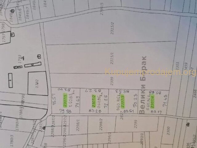 Vrlo povoljno njiva 2 hektara i 43 ari. Njiva se nalazi Veliki Borak , Barajevo.Njiva ima izlaz na asfaltirani put i na jos jedan put koji nije asfaltiran koji se proteze celom duzinom njive. Pored njive ima prikljucak za struju i vodu. njiva je potpuno ravna sto se vidi i na slikama. Odlicna je za poljoprivredno gazdinstvo . Njiva je podeljena na 4 parcele po 60,95ari, ako neko zeli da uzme celu parcelu moguce je spajanje parcela jer je vlasnik 1/1.Prikazana cena je za jednu parcel.Zvati na telefon 0615203706 .