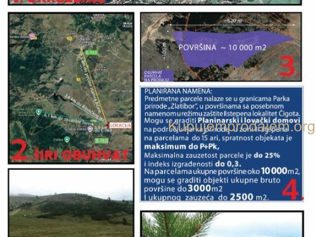 Lokacija: Ljubiš, Čigota - na oko 5 km udaljenosti vazdušnom linijom od centra Zlatibora Ova velika parcela na Zlatiboru, u području Ljubiša i Čigote, predstavlja izuzetnu priliku za investitore. Zemljište se nalazi u parku prirode 2. i 3. kategorije, gde je, u skladu sa Generalnim planom, dozvoljena gradnja planinarsko-šumskih kompleksa i kućica od prirodnih materijala poput drveta i kamena. Za gradnju je neophodna izrada urbanističkog projekta uz saglasnost Uprave za zaštitu prirode. Parcela obuhvata prirodne izvore vode za piće, a kroz imanje protiče izvorska voda. Lokacija je ekološki izuzetna jer se na njoj ukrštaju planinski i morski vazduh, pružajući jedinstven zdravstveni i prirodni ambijent. Parcela je dijagonalno smeštena u odnosu na centar Čigote, poznat zdravstveni centar za lečenje Bazedovljeve bolesti, što povećava njenu atraktivnost. Ovo zemljište je idealno za razvoj eko-kompleksa, turističkih sadržaja ili drugih kreativnih investicionih projekata. Lokacija je park prirode i eko-centar, što garantuje rast vrednosti u budućnosti. Parcela je 1/1, bez tereta, sa rešenim imovinsko-pravnim odnosima. Vlasnici, dva rođena brata, traže ozbiljne investitore kojima žele berićet u ulaganju u ovo jedinstveno imanje. Planirana namena: Predmetne parcele nalaze se u granicama Parka prirode "Zlatibor", u površinama sa posebnom namenom u režimu zaštite II stepena lokalitet Čigota. Mogu se graditi Planinarski i lovački domovi na području Parka prirode u zoni II stepena na parcelama do 15 ari, spratnost objekata maksimum do P+Pk, Maksimalna zauzetost parcele je do 25% i indeks izgrađenosti do 0,3. Na parcelama ukupne poršine oko 10000m2, mogu se graditi objekti ukupne bruto površine do 3000m2 i ukupnog zauzeća do 2500m2. Informacije o lokaciji za izgradnju "kompleksa lovačkih i planinarskih domova": Molimo ozbiljne ponuđače da se jave. Srećna kupovina i svako dobro! Kontaktirajte nas za više informacija: Radovan: +381644133341 Srđan: +38162442000
