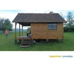 Plac je ogradjen, na njemu ima izgradjena mala kucica od drveta sa terasom.