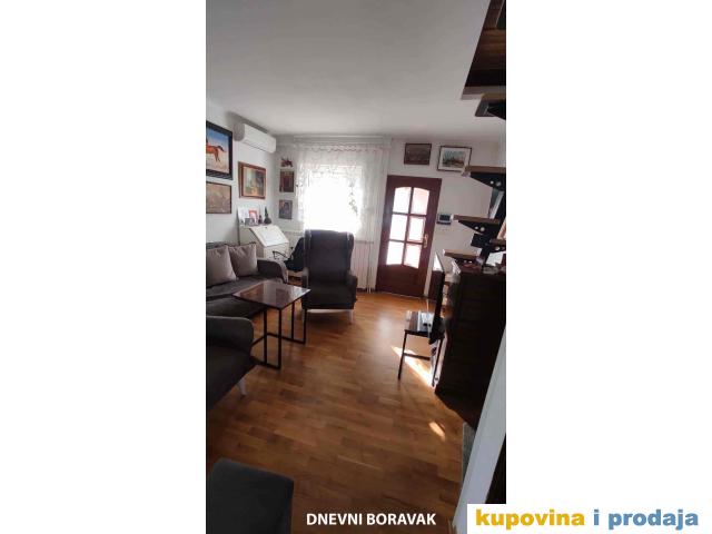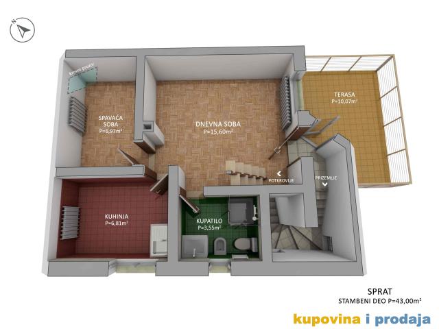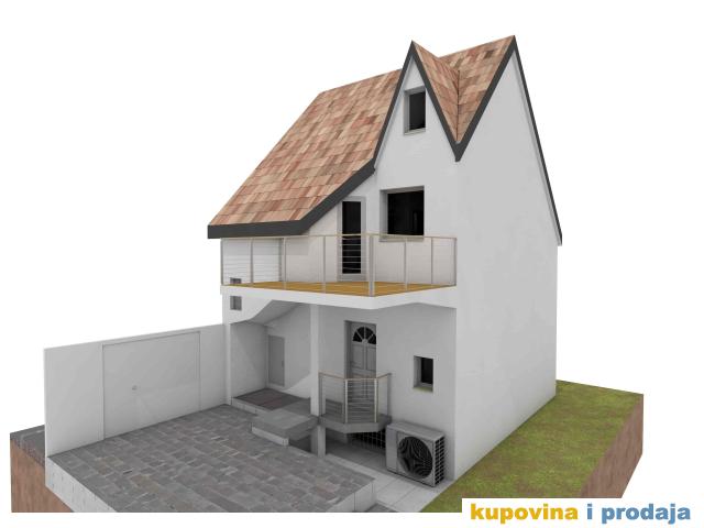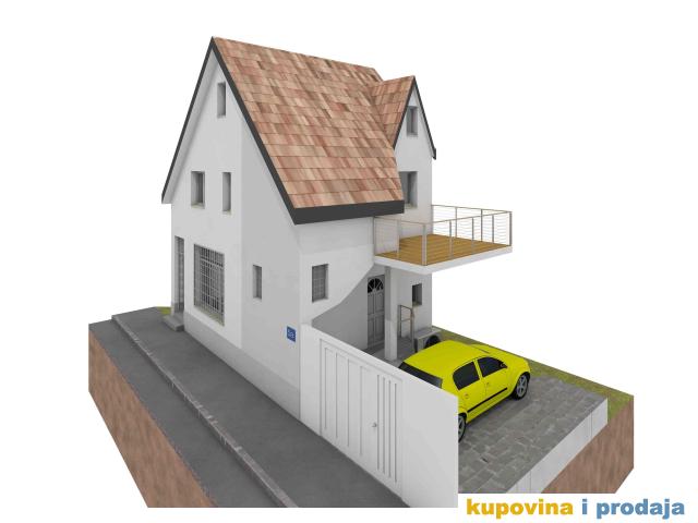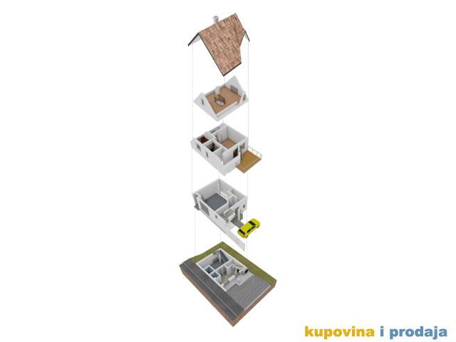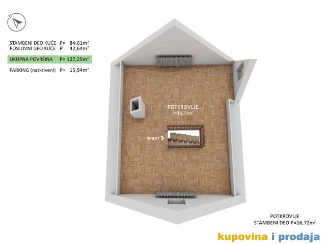 Stambeni deo P=77m2 čine: Suturen (ostava, vešernica i tehnički deo i WC sa tušem) +Prizemlje (antre, stepenište) +Prvi sprat (dnevna soba , spavaća soba, kuhinja, kupatilo, terasa) +Potkrovlje (deo spavaća i deo radna soba). Terasa je natkrivena. Površina placa pod kućom i delom koja se koristi je oko 1ar.