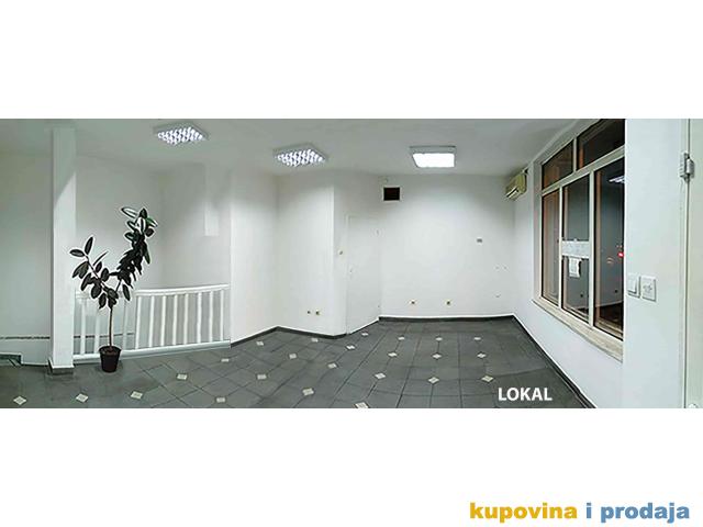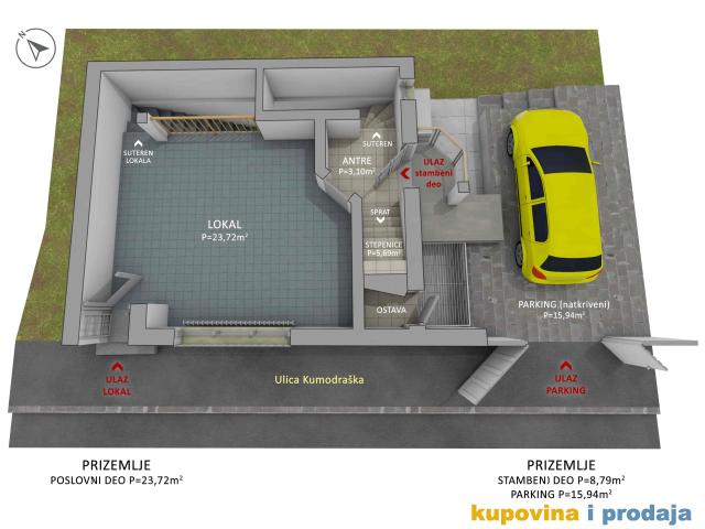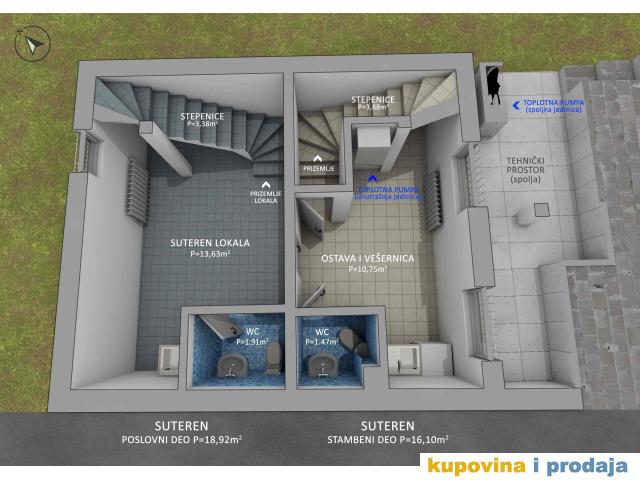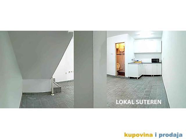 Poslovni deo P=43m2 čine: Prizemlje (lokal) +Suturen (pomoćni prostor lokala + WC).