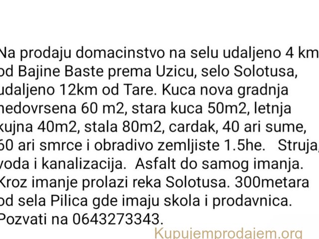 Prodaje se seosko domacinstvo 4km od Bajine Baste selo Solotusa. Plac 2.5 ha, 2 kuce, suma, stala. . . . Cena 115.000e. Kontakt 0643273343