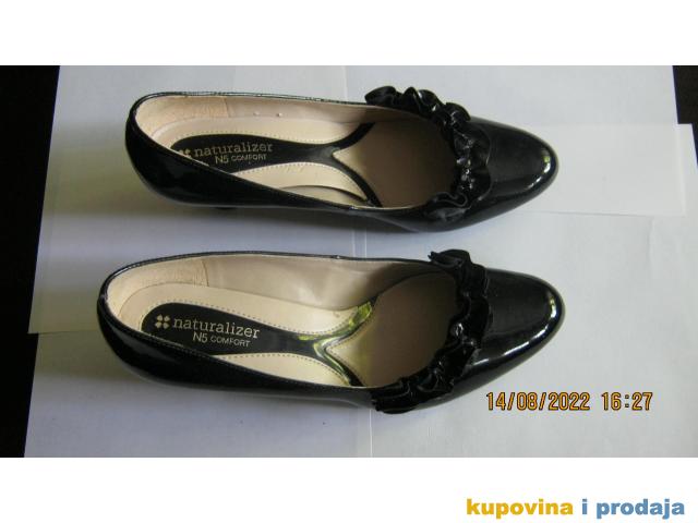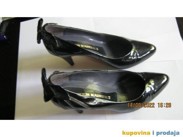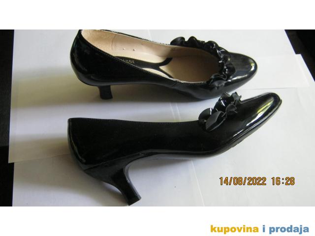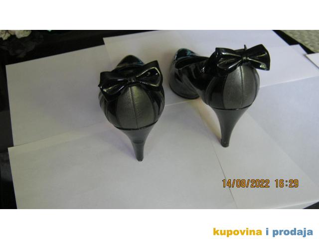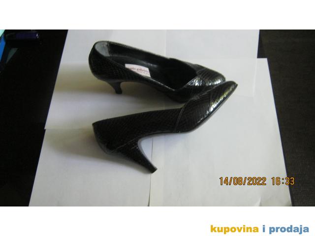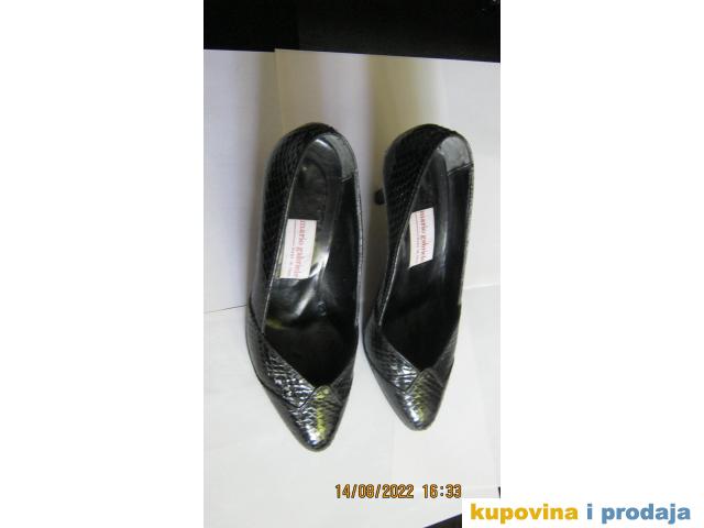 5 pari obuce, sve su crne, velicine 37, kozne i lakovane. Jedan je par od zmije salonke italijanske IMG 0459, sa stiklom od 6cm, cena 3 000 din. IMG 0451 isto italijanske lakovane sa stiklom od 8cm i cenom 4 000 din.Salonke, lak, IMG 450, sa stiklom od 4cm i ukusnim ukrasom napred oko izreza, cena 2 000 din. IMG 446 ravna lakovana cipela sa masnom napred, cena 1 500 din. I na kraju italijanske crne kozne sa koznim djonom, visokom stiklom ali one su velicina 41 i cena 2 000 din.