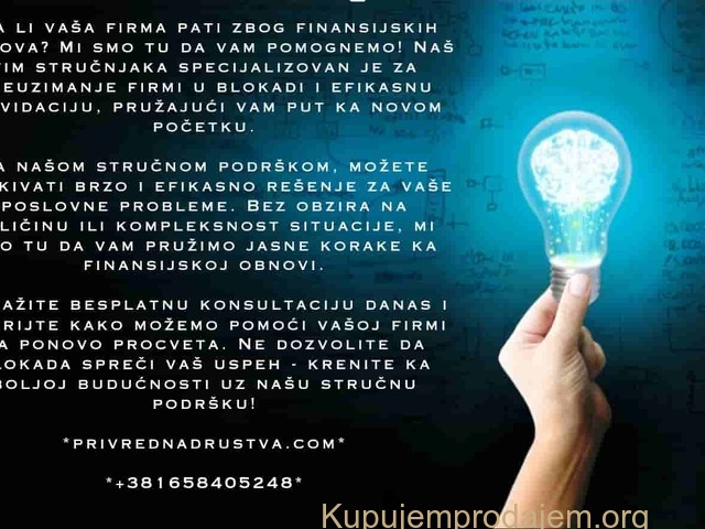 "Da li vaša firma pati zbog blokade racuna i dugova? Mi smo tu da vam pomognemo! Naš tim stručnjaka specijalizovan je za preuzimanje firmi u blokadi i likvidaciji, pružajući vam put ka novom početku.