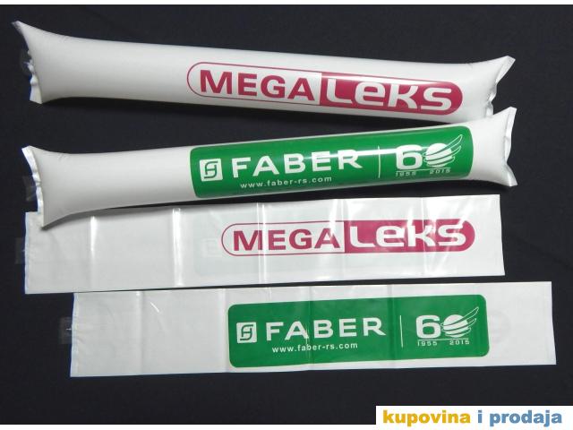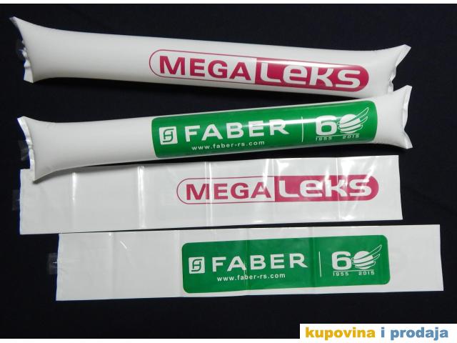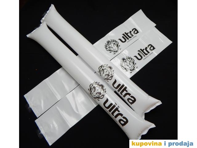 Kvalitetno stampamo navijacke udaraljke koje imamo na sopstvenom lageru. Udaraljke su jednobojne, a boje su im : bela ; zuta ; plava ; crvena ; zelena ; crna ; nebo plava i narandzasta.Naduvavaju se uz pomoc slamcice, ili ih mi naduvavamo za potrebe klijenta uz pomoc kompresora.Naduvane udaraljke pri medjusobnom udaranju proizvode glasan zvuk. Par udaraljki bez stampe spakovan je sa slamcicom za naduvavanje u celofanskoj kesici.
