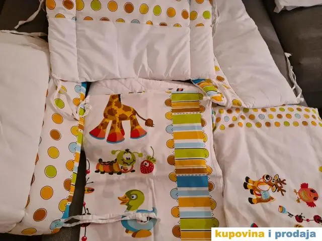 Posteljina sa ogradicom za krevetac, dimenzije 110x80.  Ogradica, carsav, jastuk, jorgan, jastucnica, jorganska navlaka. Neki delovi posteljine nisu korisceni.