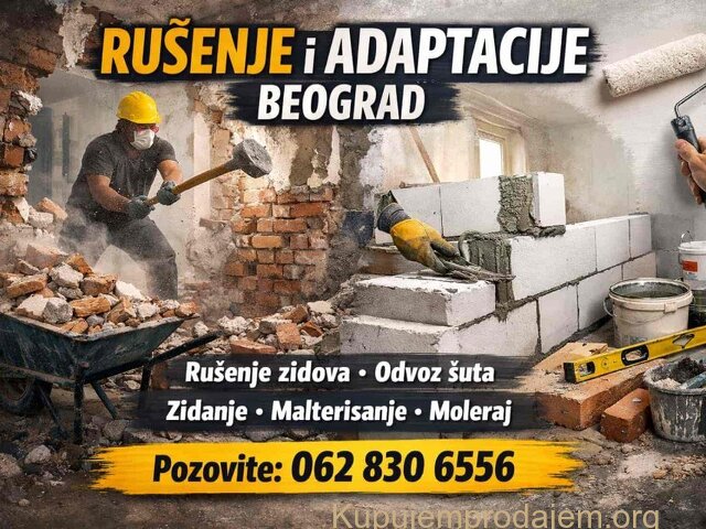 Rušenje zidova i kompletne adaptacije – Beograd, Srem i okolina Vršimo profesionalno rušenje i adaptaciju stanova i lokala na teritoriji Beograda, Srema i okoline. Rušenje pregradnih zidova (kupatilo, kuhinja, stan, lokal) Razbijanje pločica i razvaljivanje do cigle Skidanje karatavana i plafona Iznošenje i odvoz šuta Kompletne adaptacije: Zidanje i pregradjivanje Malterisanje i krpljenje zidova Šalovanje i betoniranje Molersko-farbarski radovi Brzo, pouzdano i po dogovoru. Iskusan i odgovoran tim. Ratko 062 830 6556 Beograd Pozovite za procenu i dogovor termina.