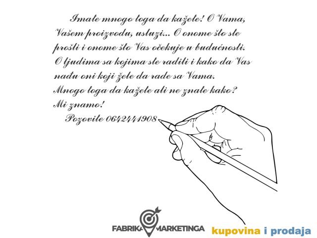 Pisanje tekstova oglasa, uputstava, slogana, protokola, brošura, članaka, govora... Pozovite nas na broj 0642441908
