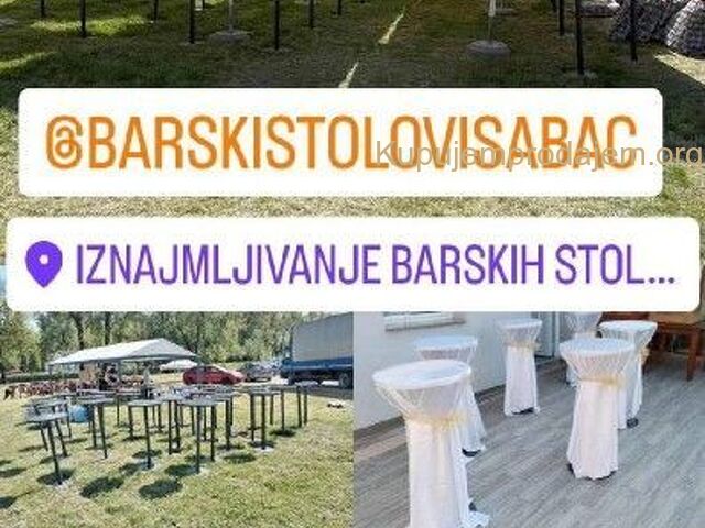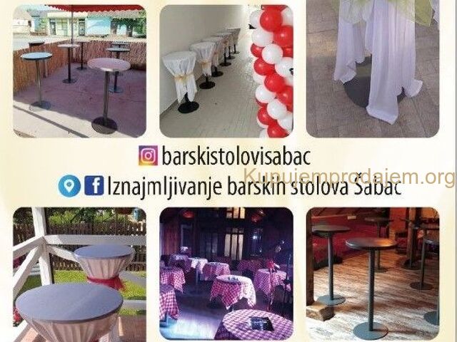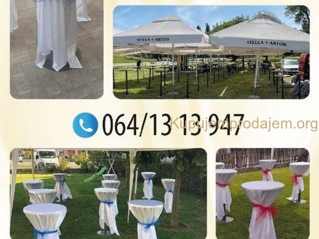 Iznajmljivanje barskih stolova i paviljona u Subotici i okolini.Prevoz i montaza su besplatni...U ponudi:-Stolovi sa belim i crnim navlakama, povoljnija varijanta je bez navlakaPrecnik stola je 80cm-Paviljoni-tende sa elegantnim zavesamadimezije: 3x3m-Ketering stolovi sa crnim i belim navlakama, dimenzije 180×75Cena na upit.Za sve dodatne informacije me kon...